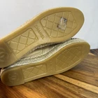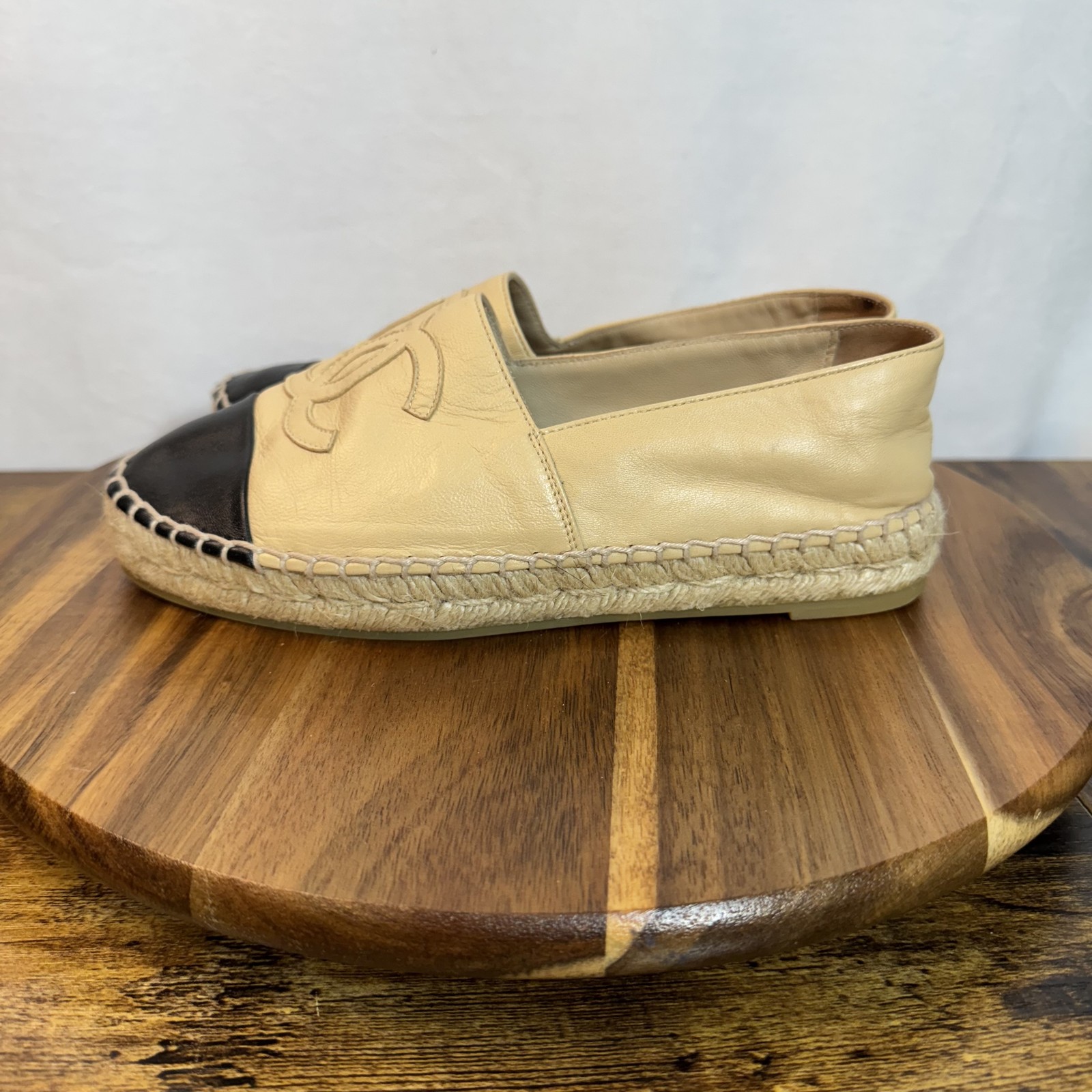 Chanel Shoes Womens Size 35 Beige Black Espadrille Leather Slip On Condition: Good pre-owned condition, shows light creasing and some wear with minor marks on the midsoles as seen in photos Made in Spain Beige and black leather upper with classic stitched CC Chanel logo on the front Espadrille jute and rubber sole construction for comfort and summer style Style code G29762 stamped inside All interior and outsole branding shown: "CHANEL" "Made in Spain" embossed on insole and sole, "CC" logo on front and tread Rubber outsole with quilt pattern, marked size 35 (EU 35) Iconic two-tone slip-on design Perfect for casual, vacation, and warm weather outfits