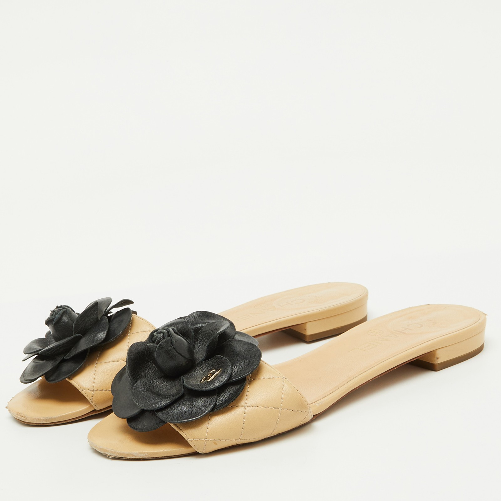 These gorgeous slides from Chanel will be your latest favorite purchase. They are made from beige quilted leather, with a contrasting Camellia motif embellishing the front. They come with comfortable leather lined insoles and gold toned hardware. Their easy slip on style and relaxing silhouette make these slides great for everyday use.Certified by The Luxury Closet - This item has gone through a detailed authentication process overseen by our experts. We offer a lifetime guarantee of authenticity on all our items. Import duties, taxes and charges are not included in the item price. These charges are the buyers responsibility. Please check with your country’s customs office to determine what these additional cost will be prior to buying. Our eBay Store About Us Contact Us Add to Favorite Sellers Chanel Beige Leather CC Camellia Flat Slide Sandals Size 39 $698.5 These gorgeous slides from Chanel will be your latest favorite purchase. They are made from beige quilted leather, with a contrasting Camellia motif embellishing the front. They come with comfortable leather lined insoles and gold toned hardware. Their easy slip on style and relaxing silhouette make these slides great for everyday use. Product Details Brand Color Beige Dimensions Material Leather Size 39 Outsole Width 8.5 cm Outsole Length 25 cm Heel Height Includes The Luxury Closet Packaging Certified by The Luxury Closet This item has gone through a detailed authentication process overseen by our experts. We offer a lifetime guarantee of authenticity on all our items. How We Check The in-house team of experts at The Luxury Closet is highly trained to verify the authenticity and the condition of the luxury products. They ensure that only 100% authentic items are put on sale.The evaluation process is unique with its own mix of assessment criteria and differs according to the category. Each item is evaluated based on the following combination of hallmarks, hardware, stitching, symmetry, material, craftsmanship, stamping, codes, hologram stickers, and packaging. Our authenticators also check if the items have been modified or amended (e.g., aftermarket diamonds, replaced batteries, repaired bags, etc.) International Buyers Import duties, taxes and charges are not included in the item price. These charges are the buyers responsibility. Please check with your country’s customs office to determine what these additional cost will be prior to buying.