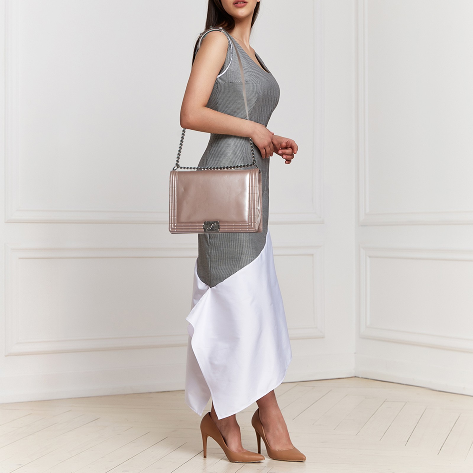 Crafted from high shine beige patent leather, this large size pre loved Reverso Boy bag reimagines Chanel’s edgy icon with soft color and statement proportions. A modern favorite with lasting impact.Certified by The Luxury Closet - This item has gone through a detailed authentication process overseen by our experts. We offer a lifetime guarantee of authenticity on all our items. Import duties, taxes and charges are not included in the item price. These charges are the buyers responsibility. Please check with your country’s customs office to determine what these additional cost will be prior to buying. Our eBay Store About Us Contact Us Add to Favorite Sellers Chanel Beige Patent Leather Large Reverso Boy Flap Bag $3441.9 Crafted from high shine beige patent leather, this large size pre loved Reverso Boy bag reimagines Chanel’s edgy icon with soft color and statement proportions. A modern favorite with lasting impact. Product Details Brand Color Beige Dimensions Material Patent Leather Size Medium Outsole Width Outsole Length Heel Height Includes Certified by The Luxury Closet This item has gone through a detailed authentication process overseen by our experts. We offer a lifetime guarantee of authenticity on all our items. How We Check The in-house team of experts at The Luxury Closet is highly trained to verify the authenticity and the condition of the luxury products. They ensure that only 100% authentic items are put on sale.The evaluation process is unique with its own mix of assessment criteria and differs according to the category. Each item is evaluated based on the following combination of hallmarks, hardware, stitching, symmetry, material, craftsmanship, stamping, codes, hologram stickers, and packaging. Our authenticators also check if the items have been modified or amended (e.g., aftermarket diamonds, replaced batteries, repaired bags, etc.) International Buyers Import duties, taxes and charges are not included in the item price. These charges are the buyers responsibility. Please check with your country’s customs office to determine what these additional cost will be prior to buying.