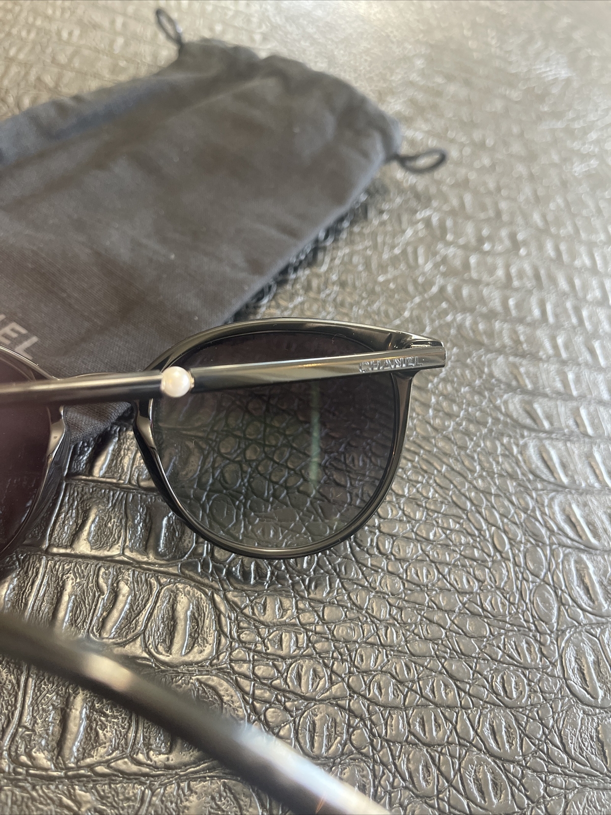 Chanel Black Sunglasses with Pearl on each Side Acetate Butterfly 5394 Chanel Black Sunglasses Acetate Butterfly #5394 Features a black frame with arms etched Chanel logo and a faux pearl on each Side. Height: 2.00 in Width: 5.25 in Length: 5.25 in Brand New with Tag Chanel Black Pouch Included