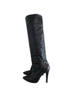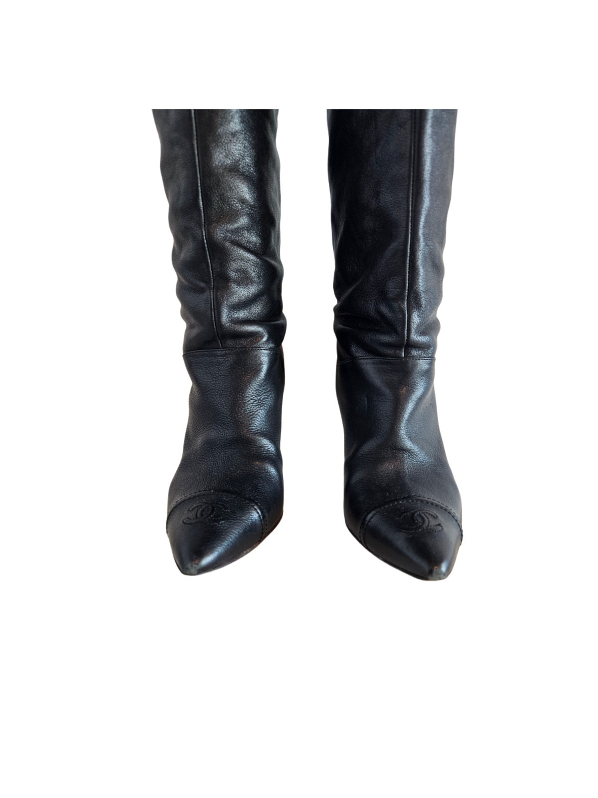 Chanel Black CC Logo Leather Knee High Boots Attributes Material: Leather Colo: Black Size: 37 Condition: good condition, has scuffed on the pointed toe & heels, sign of used on the outersole