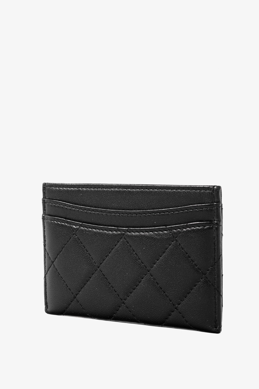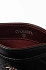 Made in Italy, this card holder from Chanel is crafted in a black lambskin leather with diamond quilting throughout, and features a silver-tone interlocking CC logo on the front, three card slots, and a burgundy textile-lined slot in the middle. Condition: Excellent; very faint scratching on exterior, hairline scratching on logo. Comes with authenticity card, care booklets, and box. Approximate measurements: Height: 3" (7.5 cm) Width: 4.25" (11 cm) Composition: Leather, textile lining, metal hardware.