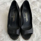 Rare CHANEL Women's Open Toe Pumps Black Leather Chain CC Wedge Heel Size 34.5 Description Brand: CHANEL Size: 34.5 ( Approximately 21.5 cm / 8.5 inches ) Color: Black Material: Leather Heel Height: 8.5 cm / 3.35 inches Condition: Scratches and signs of use on the heel. Accessories: None (Main item only) Design: Open toe, CC logo, chain accent, wedge sole. Features: Elegant and luxurious design. Thank you very much for visiting my auction. Language: Japanese Please judge with a photograph. Please have a question I want to do a good deal Payment I accept PAYPAL Payoneer Please make the payment within 5 days after the end of auction. Shipping Worldwide Shipping: Economy shipping, Japan Post, with tracking number EMS+20$ (insurance &tracking number 3-7 days to USA.) Terms of Sale If you would like to know more about this item, please contact me before bidding. Items will be sent out within 4 business days after the payment received. When there is a different problem from the indicated contents, please tell me about it within two week. I accept returns only if items did not match the description. Buyer pays return shipping. About Us Return is accepted if only the item is different from item's description. Thank you for looking!!! International Buyers - Please Note: ・Import duties, taxes and charges are not included in the item price or shipping charges. These charges are the buyer’s responsibility. ・Please check with your country’s customs office to determine what these additional costs will be prior to bidding/buying. ・These charges are normally collected by the delivering freight (shipping) company or when you pick the item up - do not confuse them for additional shipping charges. ・We do not mark merchandise values below value or mark items as “gifts” - US and International government regulations prohibit such behavior.
