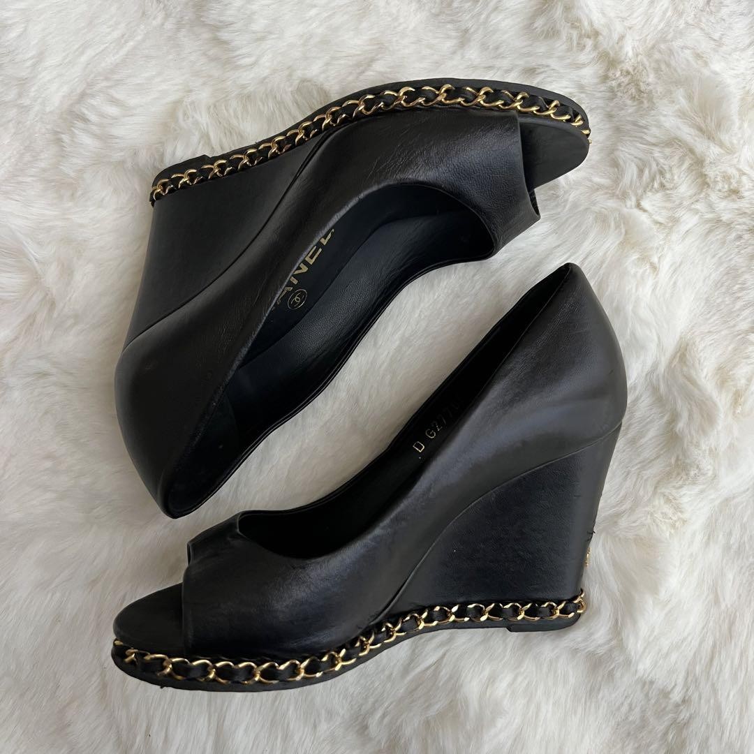 Snagged these rare Chanel wedges and they're even more stunning in person! The black leather and signature chain are so chic. Perfect height and surprisingly comfortable for all-day wear. An absolute treasure find!
