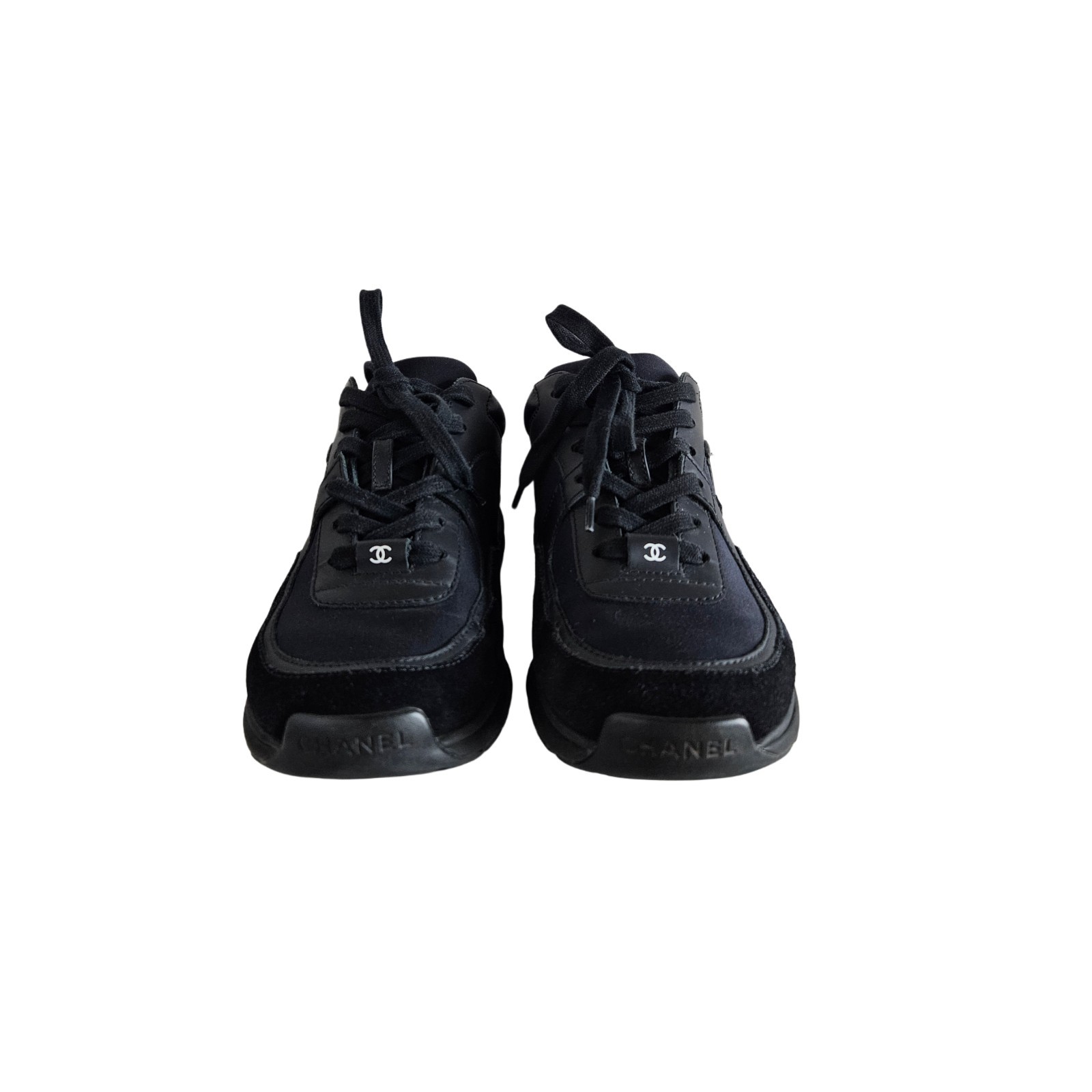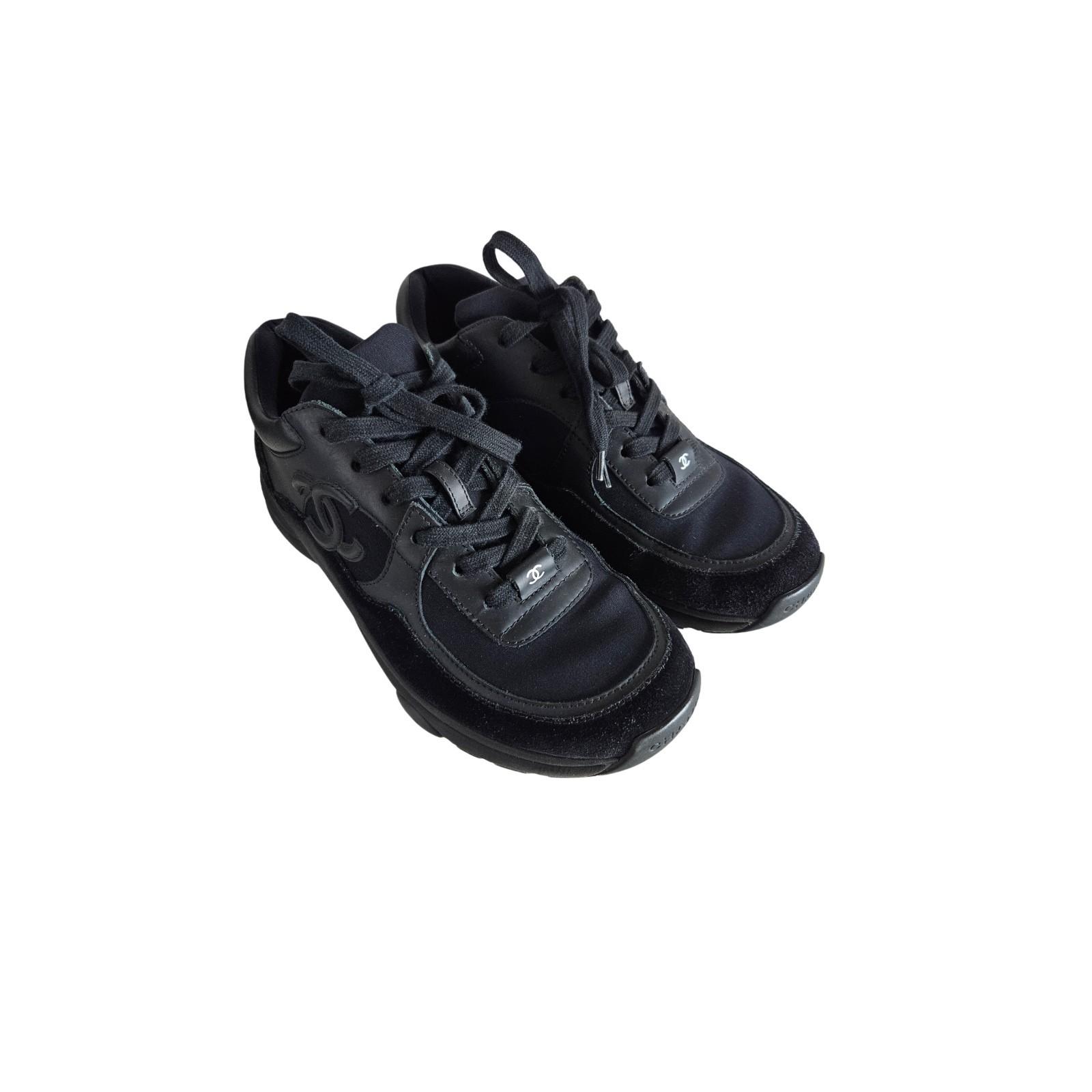 Chanel Black Leather and Suede CC Lace Up Sneakers, Size 38 Attributes Material: Leather/Suede Size: 38 Color: Black Condition: Excellent