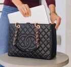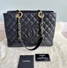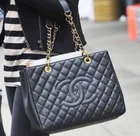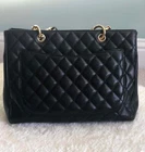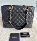 This is an authentic CHANEL Caviar Quilted Grand Shopping Tote GST in Black. This stylish tote is crafted of black diamond quilted caviar leather. This shoulder bag features leather threaded polished gold chain-link shoulder straps with shoulder pads, a quilted Chanel CC logo on the front, and a flat pocket on the rear. The top opens to a zipper partitioned black satin interior with pockets. Size Base length: 13.25 in Height: 9.75 in Width: 5 in Drop: 8.5 in Comes w Authenticity Card,organizer and Chanel dust bag.