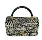 This Chanel Tweed Coco Handle Black Tweed Purse is a must-have for any fashionable woman. The exterior color is a classic black that will match any outfit, while the accents of crochet add a touch of elegance. The brand is Chanel, a name that speaks for itself in the fashion world. The purse is perfect for carrying everyday essentials and will fit comfortably in any bag. Whether you're going out for a night on the town or just running errands, this purse will add a touch of sophistication to any outfit. Includes original box that the purse was sold in.