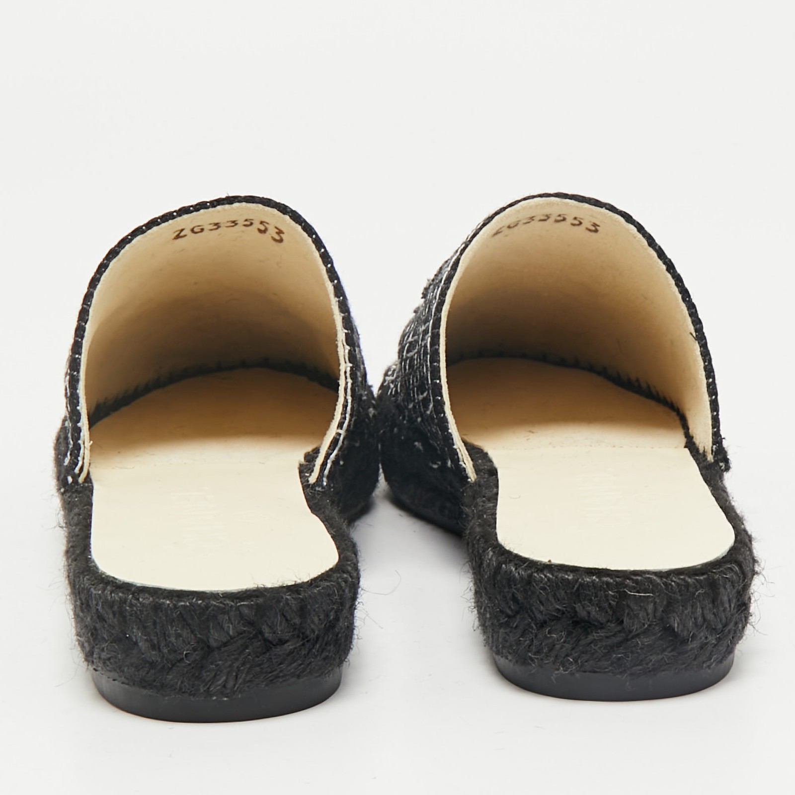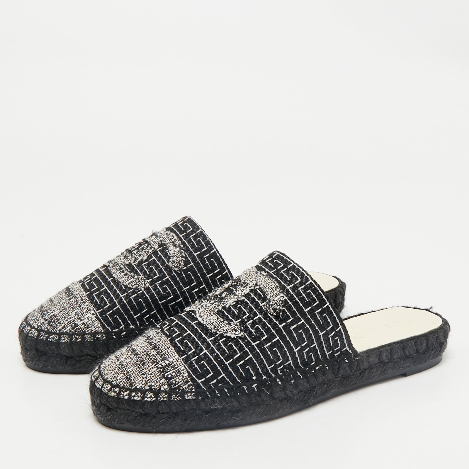 A perfect blend of luxury, style, and comfort, these designer mules are made using quality materials and frame your feet in the most elegant way. They can be paired with a host of outfits from your wardrobe.Certified by The Luxury Closet - This item has gone through a detailed authentication process overseen by our experts. We offer a lifetime guarantee of authenticity on all our items. Import duties, taxes and charges are not included in the item price. These charges are the buyers responsibility. Please check with your country’s customs office to determine what these additional cost will be prior to buying. Our eBay Store About Us Contact Us Add to Favorite Sellers Chanel Black/White Tweed CC Espadrille Mules Size 36 $619.3 A perfect blend of luxury, style, and comfort, these designer mules are made using quality materials and frame your feet in the most elegant way. They can be paired with a host of outfits from your wardrobe. Product Details Brand Color Black Dimensions Material Tweed Size 36 Outsole Width Outsole Length Heel Height Includes Certified by The Luxury Closet This item has gone through a detailed authentication process overseen by our experts. We offer a lifetime guarantee of authenticity on all our items. How We Check The in-house team of experts at The Luxury Closet is highly trained to verify the authenticity and the condition of the luxury products. They ensure that only 100% authentic items are put on sale.The evaluation process is unique with its own mix of assessment criteria and differs according to the category. Each item is evaluated based on the following combination of hallmarks, hardware, stitching, symmetry, material, craftsmanship, stamping, codes, hologram stickers, and packaging. Our authenticators also check if the items have been modified or amended (e.g., aftermarket diamonds, replaced batteries, repaired bags, etc.) International Buyers Import duties, taxes and charges are not included in the item price. These charges are the buyers responsibility. Please check with your country’s customs office to determine what these additional cost will be prior to buying.