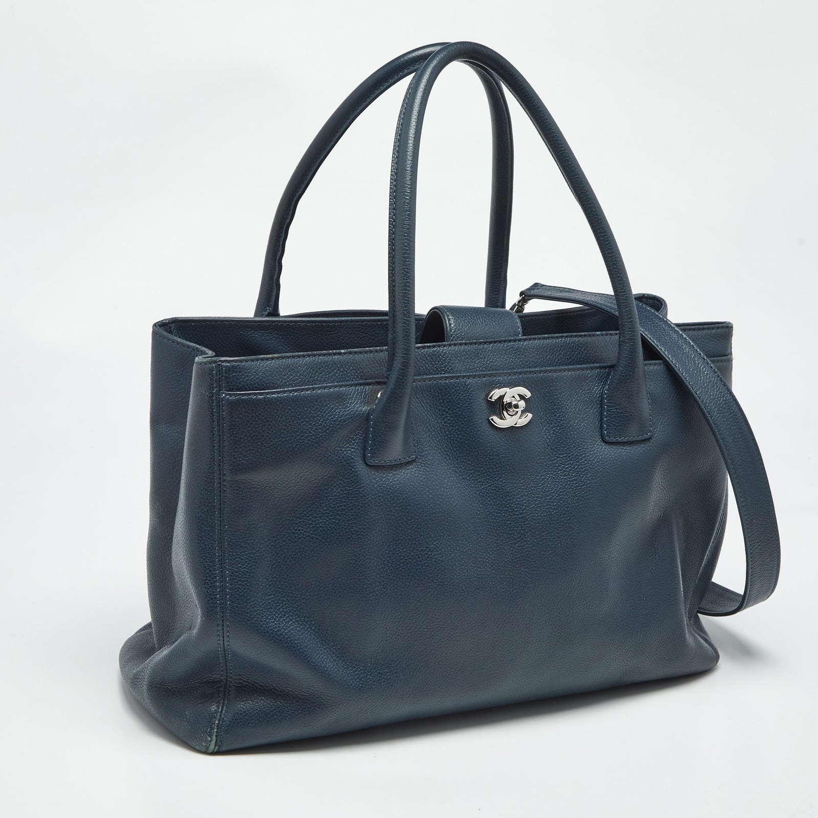This Cerf tote from Chanel is a perfect blend of function and style. It features a blue leather construction that is enhanced with a silver tone CC logo on the front and dual top handles. It is equipped with a spacious interior that can easily hold your daily essentials and protective metal feet.Certified by The Luxury Closet - This item has gone through a detailed authentication process overseen by our experts. We offer a lifetime guarantee of authenticity on all our items. Import duties, taxes and charges are not included in the item price. These charges are the buyers responsibility. Please check with your country’s customs office to determine what these additional cost will be prior to buying. Our eBay Store About Us Contact Us Add to Favorite Sellers Chanel Blue Leather Executive Cerf Tote $1697.3 This Cerf tote from Chanel is a perfect blend of function and style. It features a blue leather construction that is enhanced with a silver tone CC logo on the front and dual top handles. It is equipped with a spacious interior that can easily hold your daily essentials and protective metal feet. Product Details Brand Color Blue Dimensions Material Leather Size Outsole Width Outsole Length Heel Height Includes Certified by The Luxury Closet This item has gone through a detailed authentication process overseen by our experts. We offer a lifetime guarantee of authenticity on all our items. How We Check The in-house team of experts at The Luxury Closet is highly trained to verify the authenticity and the condition of the luxury products. They ensure that only 100% authentic items are put on sale.The evaluation process is unique with its own mix of assessment criteria and differs according to the category. Each item is evaluated based on the following combination of hallmarks, hardware, stitching, symmetry, material, craftsmanship, stamping, codes, hologram stickers, and packaging. Our authenticators also check if the items have been modified or amended (e.g., aftermarket diamonds, replaced batteries, repaired bags, etc.) International Buyers Import duties, taxes and charges are not included in the item price. These charges are the buyers responsibility. Please check with your country’s customs office to determine what these additional cost will be prior to buying.