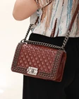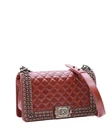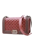 Chanel burgundy Boy shoulder bag featuring quilted leather, aged gunmetal hardware, braided chain trim at top flap, push lock closure with CC logo, adjustable shoulder strap, one lined compartment, and slip pocket inside.