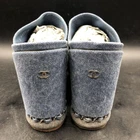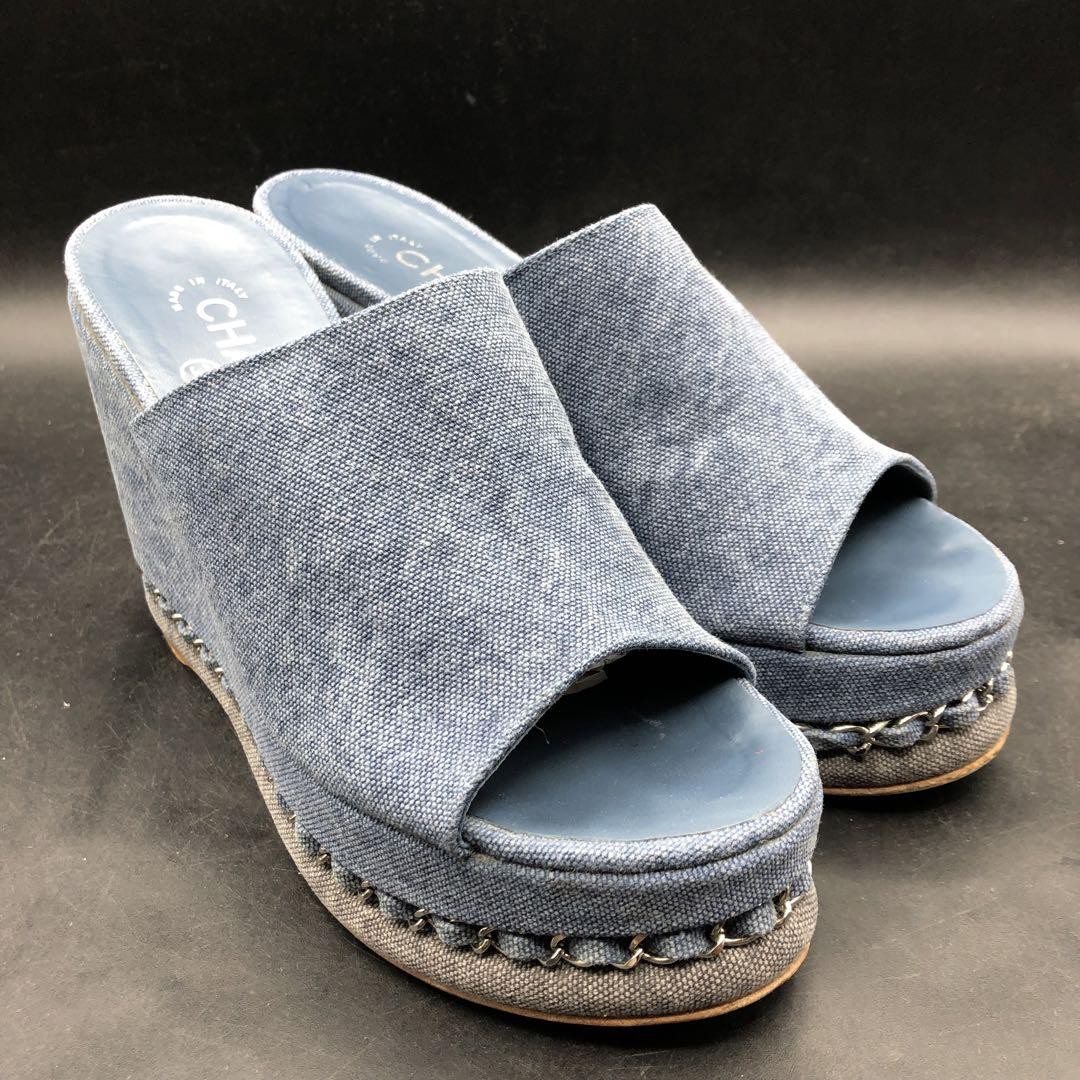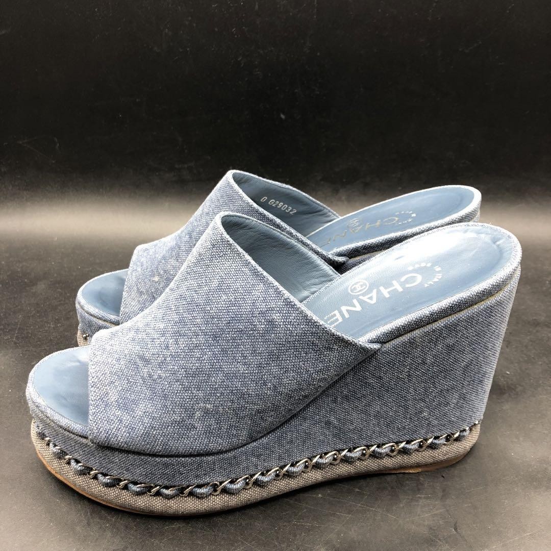 Rare CHANEL CC Logo Denim Wedge Sandals Blue Chain Trim Women's Size 36.5 Description * Brand: CHANEL * Size: 36.5 (Approximately 23.0-23.5cm / US 6 / UK 3.5) * Color: Blue Denim * Condition: Gently Used (AB) * Material: Denim, Chain Trim * Heel Height: 11.5cm (Approximately 4.5 inches) Thank you very much for visiting my auction. Language: Japanese Please judge with a photograph. Please have a question I want to do a good deal Payment I accept PAYPAL Payoneer Please make the payment within 5 days after the end of auction. Shipping Worldwide Shipping: Economy shipping, Japan Post, with tracking number EMS+20$ (insurance &tracking number 3-7 days to USA.) Terms of Sale If you would like to know more about this item, please contact me before bidding. Items will be sent out within 4 business days after the payment received. When there is a different problem from the indicated contents, please tell me about it within two week. I accept returns only if items did not match the description. Buyer pays return shipping. About Us Return is accepted if only the item is different from item's description. Thank you for looking!!! International Buyers - Please Note: ・Import duties, taxes and charges are not included in the item price or shipping charges. These charges are the buyer’s responsibility. ・Please check with your country’s customs office to determine what these additional costs will be prior to bidding/buying. ・These charges are normally collected by the delivering freight (shipping) company or when you pick the item up - do not confuse them for additional shipping charges. ・We do not mark merchandise values below value or mark items as “gifts” - US and International government regulations prohibit such behavior.