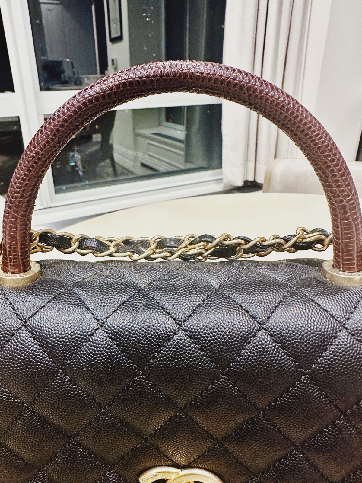 PRICE REDUCED!!! This is an authentic pre-loved Chanel Caviar Lizard Quilted Medium Coco Handle Flap in black. She is a stunningly gorgeous vintage classic! Diamond-stitched grained caviar calfskin leather; features a burgundy lizard top handle; lizard top handle shows minor wear on the inferior side; optional shoulder strap; vintage gold CC turn-lock closure; black inferior; hardware reflects a vintage sheen; no returns FINAL SALE; buyer assumes all responsibility once I ship this item. I offer local pick up for Chicago residents. NO DUST COVER. KEEP IN MIND THAT THIS IS A VINTAGE PIECE - AS SUCH, THE HARDWARE REFLECTS THE VINTAGE LOOK ~ THIS BAG IS IN MINT CONDITION AND A STEAL AT THE PRICE ASKED. INTERNATIONAL SHIPPING NOT OFFERED