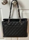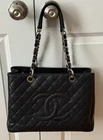 Description This is an authentic CHANEL Caviar Quilted Grand Shopping Tote GST in Black. This stylish tote is crafted of diamond quilted caviar leather in black. The bag features a rear slip pocket, leather threaded chain straps with leather shoulder pads, and a quilted Chanel CC logo on the front and back. The top is open to a partitioned black fabric interior with zipper and patch pockets. Condition: Very Good Exterior: The exterior leather is free of any cracking. The exterior corners show minor signs of wear as pictured. Creasing due to how it was stored. Strap: The strap shows no signs of use, leather is in perfect condition Hardware: The magnetic closure operates properly. No signs of wear Interior: The interior is clean and free of rips or tears. It includes two zipper pockets. Size Length: 13.5 in Height: 10 in Width: 5.5 in Strap Drop: 10"