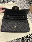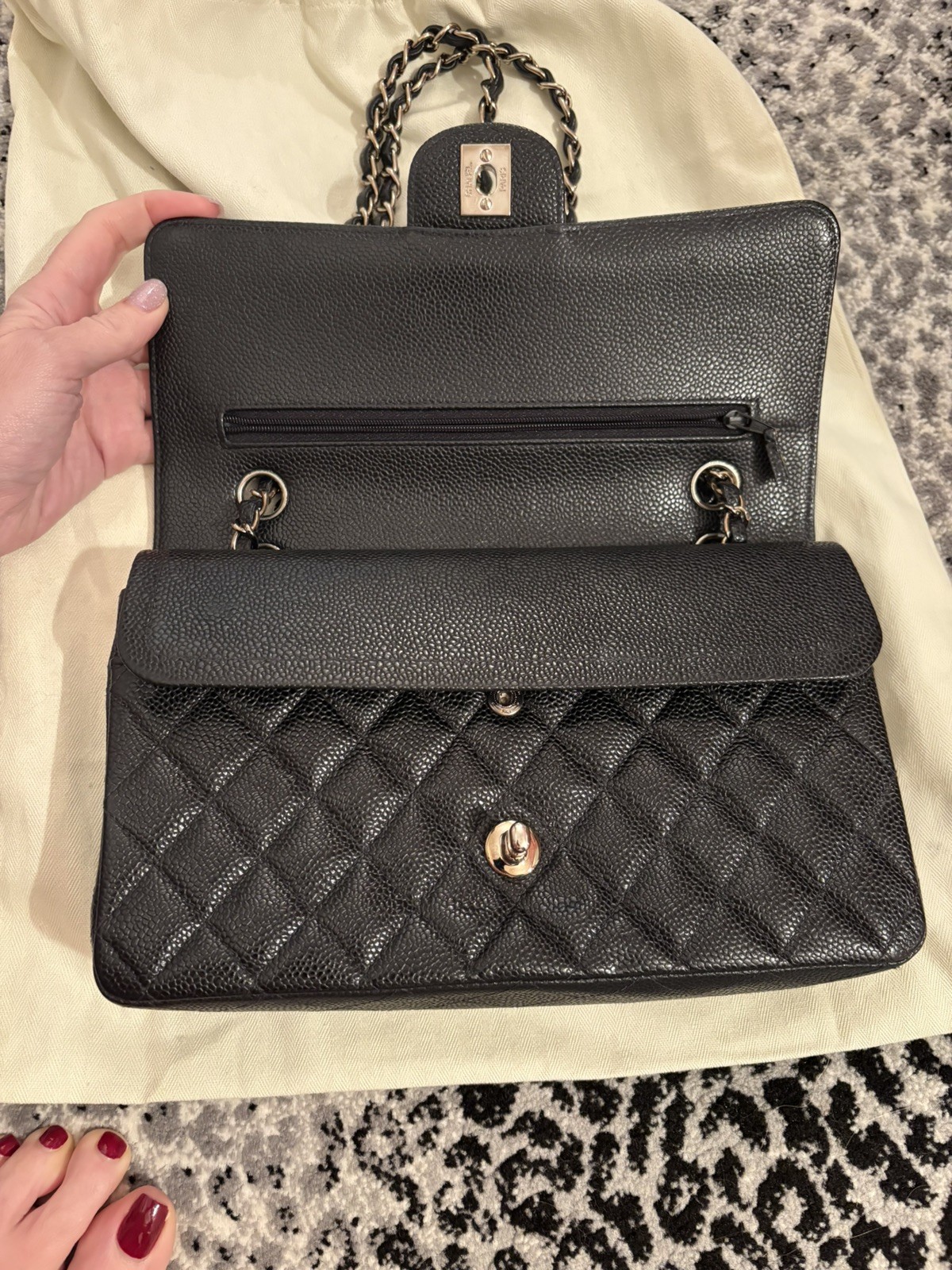 The Chanel Caviar Quilted Medium Double Flap Black Bag is a luxurious handbag designed for women. With a classic Chanel design, this bag features a black leather exterior with gold hardware and a burgundy lining. The medium size and crossbody style make it practical for everyday use, while the quilted finish adds a touch of elegance. Perfect for adding a touch of Chanel glamour to any outfit, this bag is a stylish and sophisticated accessory for any woman's wardrobe.