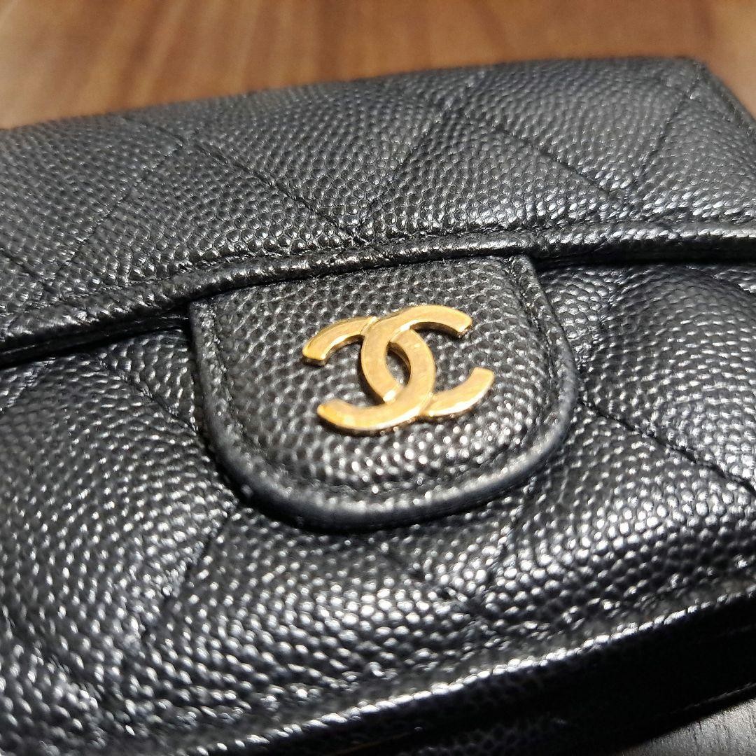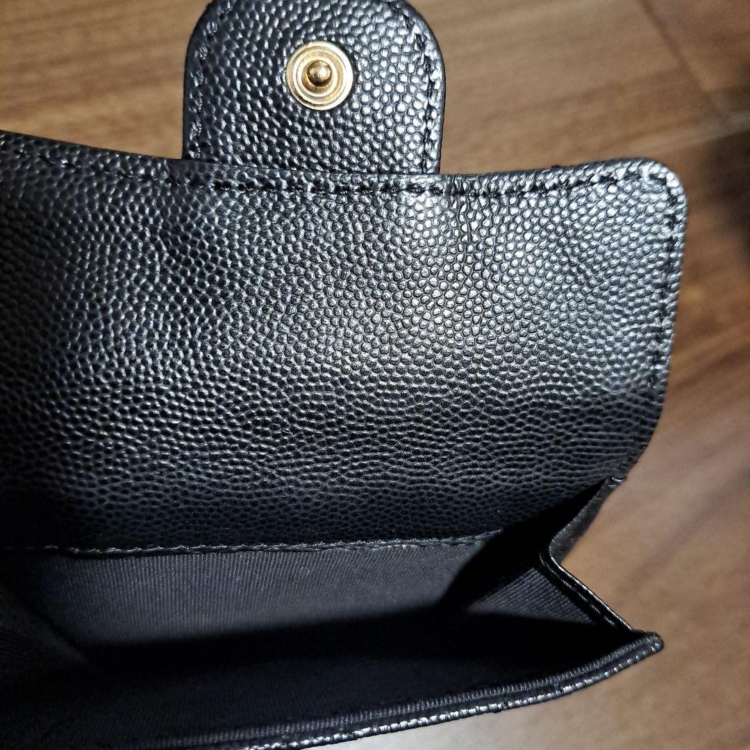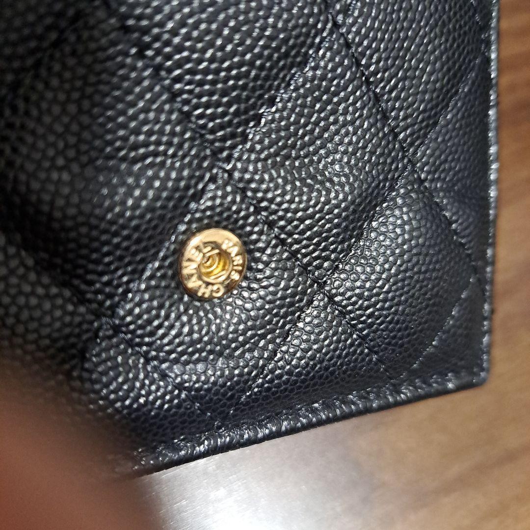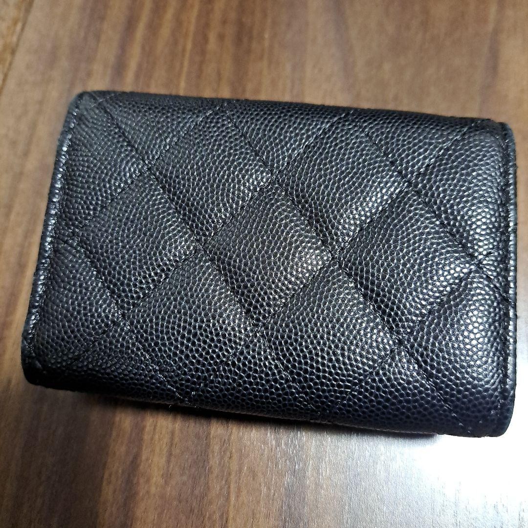 **Title:** Chanel Caviar Skin Trifold Mini Wallet Black Mint Condition **Description:** This is a small wallet from CHANEL. It comes in the popular black color. This item is highly sought after and often sells out quickly. - **Brand:** CHANEL - **Product Name:** Caviar Skin Matelassé Coco Mark Double Snap Trifold Compact Wallet - **Size:** Approximately 7.5 cm (H) x 10.5 cm (W) x 3.5 cm (D) - **Accessories:** Serial seal only - **Color:** Black with gold hardware The wallet is in excellent condition. There are no noticeable scratches. The snap closure works perfectly. Please note that the condition is subjective. Returns will not be accepted if the item does not meet your expectations. This item was purchased from another seller and has never been used since. It may be listed on other sites, so it could be removed at any time. Thank you for your understanding.