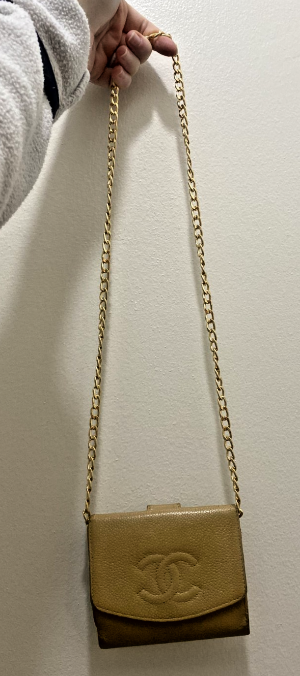 This is an AUTHENTIC Chanel Caviar Compact Wallet that has been converted into a shoulder/crossbody bag. The wallet itself has original hardware, however the chain and insert are unbranded (can be removed). This wallet still includes it's Chanel card and original paper inserts. This is a super cute and fashionable piece perfect for a night out or just a busy person on the go wanting a small but functional bag! My shop sells one-of-a kind up-cycled pieces, perfect for those who love designer fashion but want to shop second-hand. All chains, and added hardware/accessories seen in the photos come with the bags. This is VINTAGE so there are signs of wear, mainly discoloration in the coin pouch from coin oxidation and minor discoloration of the interior leather from oil, but overall is in great vintage condition. All snaps work. Please ensure you understand this is a vintage piece before purchase that has been pre-loved. These have been authenticated prior to me purchasing the pieces.