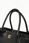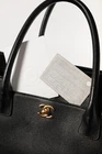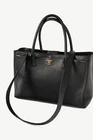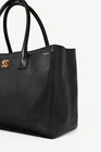 Made in Italy, this Cerf Executive tote from Chanel is crafted in a black pebbled leather, and features gold-tone hardware, two top rolled handles, a detachable shoulder strap, front and back slip pockets with an interlocking CC turnlock closure on the front, and protective bottom feet. Secured with a magnetic-snap tab, the main compartment is crafted in a tonal textile, and features a removable zip divider, and two zip pockets. Condition: Excellent; light corner rub, some scratching on bottom, some discolouration on bottom feet, light wear on inner top leather trim, light signs of wear on lining. Comes with authenticity card and care booklet. Approximate measurements: Height: 9" (23 cm) Width: 13.75" (35 cm) Depth: 5.5" (14 cm) Handle Drop: 6.5" (16.5 cm) Strap Drop: 17" (43 cm) Composition: Leather, textile lining, metal hardware.