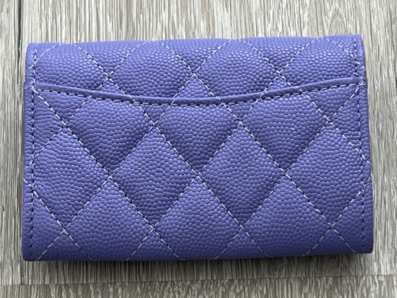 This Chanel Classic Flap Card Holder features luxurious purple caviar leather and elegant gold-tone hardware. It’s in pristine, never-used condition, just as perfect as if you picked it up from the boutique yourself. I’ve listed it as “pre-owned” simply because I’m a private seller and not an authorized Chanel retailer, even though the item is brand new.