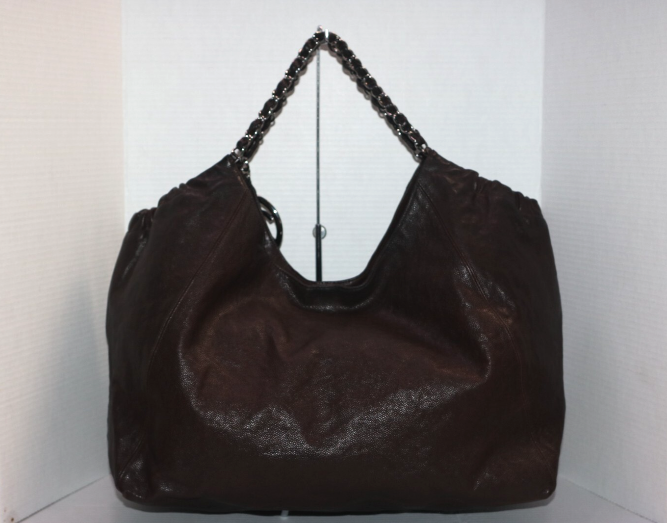 Chanel Coco Cabas Brown Distressed Caviar XL Bag **BAG ONLY** ** DOES NOT COME WITH REMOVABLE POUCH. NO DUST BAG OR BOX. NO CARD.** A classic Chanel tote in distressed brown caviar leather with a central stitched CC logo and silver-tone hardware. Features leather threaded silver chain top handle and a polished silver Chanel CC medallion. This extremely spacious Chanel has a monogram fabric interior that features a patch pocket and zipper pocket where you can keep your small items in. This easy-to-carry, elegant tote is made for everyday excursions. Size(inch) : W17 (22" when laid flat) x H14 x D7 inch (Approx) Handle drop: 9" long