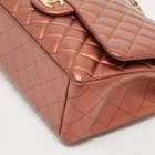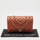 Our eBay Store About Us Contact Us Add to Favorite Sellers Chanel Copper Quilted Leather Maxi Classic Double Flap Bag Reimagined season after season, the classic designs from Chanel manages to retain their classic glamour and noteworthy silhouettes. From one of the most celebrated collections, this Double Flap bag is enriched with historic details and functional elements. The bag can be conveniently carried with an interwoven chain handle and is adorned with gold-tone accents. With a refined construction, it comes made from quilted leather, and the signature 'CC' turn-lock on the front flap leads the way to a perfectly sized interior. Product Details Brand Chanel Includes The Luxury Closet Packaging Certified by The Luxury Closet This item has gone through a detailed authentication process overseen by our experts. We offer a lifetime guarantee of authenticity on all our items. How We Check The in-house team of experts at The Luxury Closet is highly trained to verify the authenticity and the condition of the luxury products. They ensure that only 100% authentic items are put on sale.The evaluation process is unique with its own mix of assessment criteria and differs according to the category. Each item is evaluated based on the following combination of hallmarks, hardware, stitching, symmetry, material, craftsmanship, stamping, codes, hologram stickers, and packaging. Our authenticators also check if the items have been modified or amended (e.g., aftermarket diamonds, replaced batteries, repaired bags, etc.) Please note that this handbag may have a perfume scent, as it was stored and packaged in Dubai where such fragrances are commonly used. International Buyers Import duties, taxes and charges are not included in the item price. These charges are the buyers responsibility. Please check with your country’s customs office to determine what these additional cost will be prior to buying.