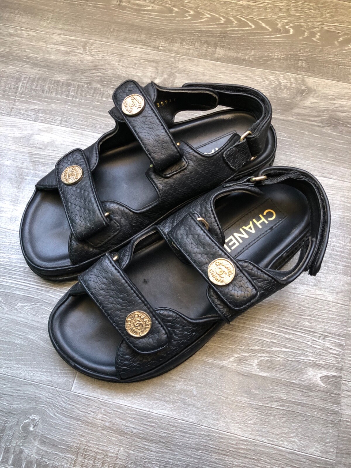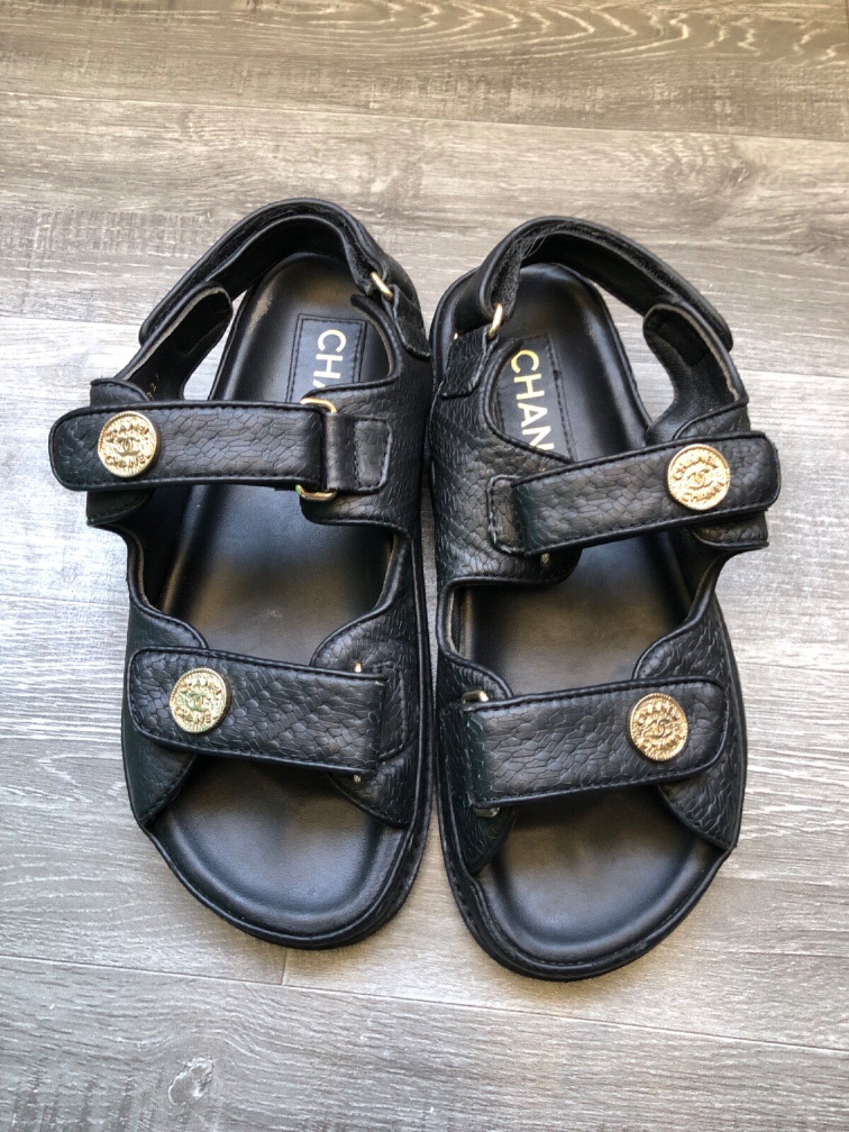 The product is a pair of CHANEL women's sandals in size 4 UK, 7 US, and 37 EU. They are black leather flat sandals with a standard width and leather outsole. These sandals are designed with a stylish and modern "dad sandal" look. They are made in Italy with leather upper and insole materials, making them a luxurious and fashionable choice for any outfit.
