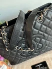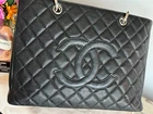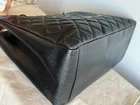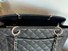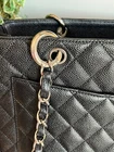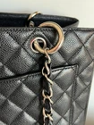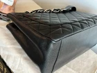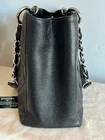 Chanel Caviar GST Grand Shopping Tote in Black with Silver Hardware. This beautiful Chanel bag is fan favorite! The bag boasts black diamond quilted caviar leather, a threaded polished silver chain link shoulder strap with shoulder pads, quilted CC logo on the front, a flat pocket on the rear, a partitioned satin interior with central zipper compartment, a zipper pocket and a patch pocket. This medium sized tote bag is perfectly sized and sits comfortably on the shoulder. Measurements are approx: 13.25" x 9.75" x 5" with an 8.5" drop. This bag is preowned. It has been well cared for. The caviar leather exterior has minor scuffs, flaws, rubbing, surface wear,marks. The hardware is in good condition with light scuffing as this is unavoidable. There is creasing in the leather handle straps. The interior will show light marks, spots, scuffing and signs of use. There is a teensy spot of peeling on the front below the CC logo to the right of the logo. VERY small and very difficult to see. This bag is still a show stopper and it remains popular due to comfortable carrying style. Please view the photos as they are part of the description. Please feel free to ask questions!! Listing includes: Chanel GST Shopper Tote with authenticity card. Shipping in the Continental USA only. All sales are final. I do participate in ebay's authenticity guarantee program. Shipping will be USPS, UPS or FED EX to authenticator. This is seller's choice. * *Please note - I make every attempt to ship next day, however on occasion I travel for business. It is possible this item may not ship for 5-7 business days.
