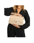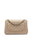 This Jumbo Classic Double Flap bag is in iridescent beige caviar leather with gold hardware and features a front flap with signature CC turnlock closure, half moon back pocket, and adjustable interwoven gold tone chain link and beige leather shoulder strap. The interior is lined in beige leather with a "love letter" zipper compartment under the first flap, an "outer" slit pocket is under the second flap and an interior compartment has two open pockets separated by a "lipstick" compartment.