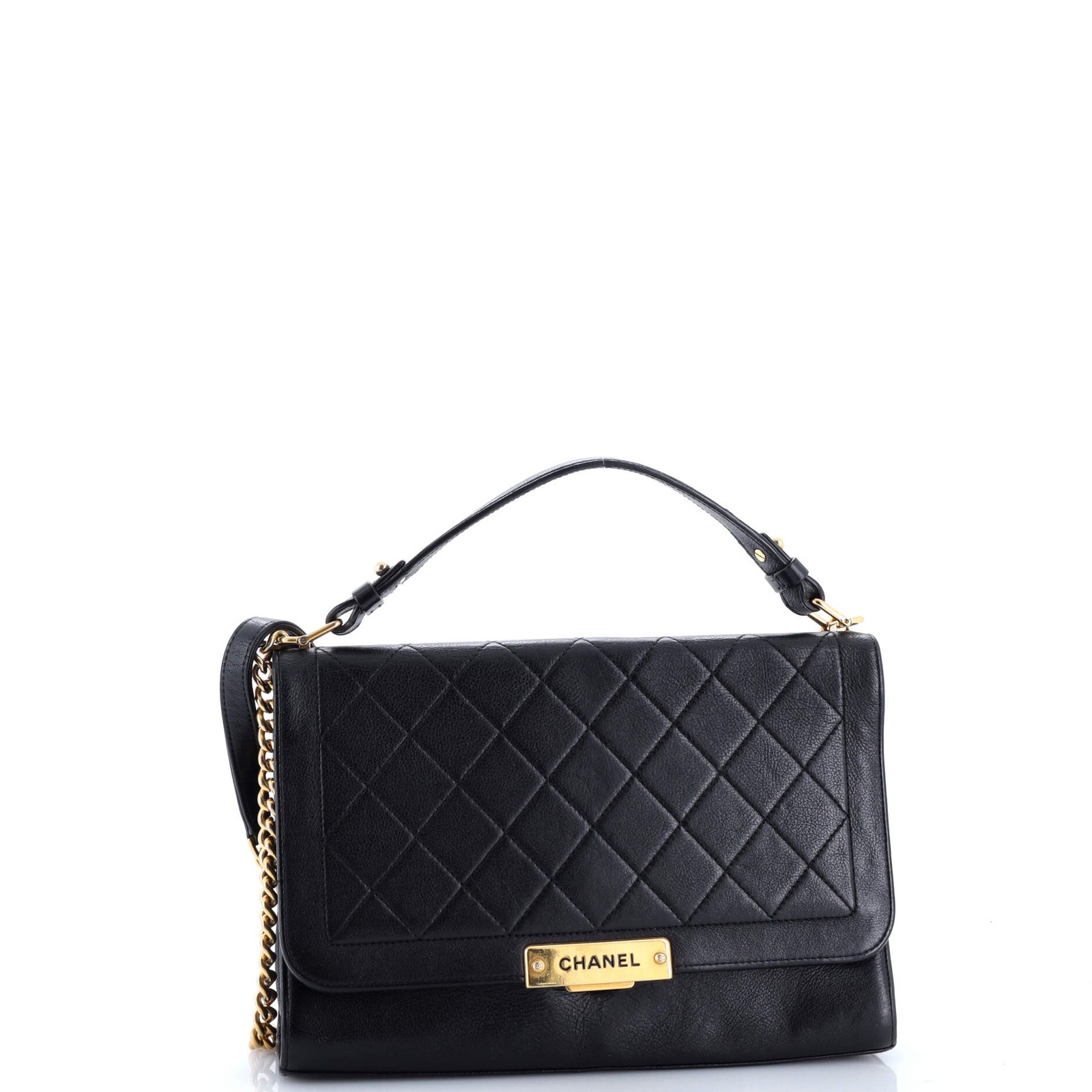 These are professional pictures of the actual item offered by Rebag. Condition: Very good. Exterior: scuffs, creases, corner wear | Handles/Straps: creases, discoloration | Interior: moderate odor, scuffs, discoloration, minor stains | Hardware: scratches, tarnished Accessories: No Accessories Measurements: Handle Drop 2.5", Height 8", Width 11.5", Depth 4", Strap Drop 20" Designer: Chanel Model: Label Click Flap Bag Quilted Calfskin Large Exterior Material: Leather Exterior Color: Black Interior Material: Fabric Interior Color: Neutral Hardware Color: Gold Brand Code: 23583460 Item Number: 353351/1