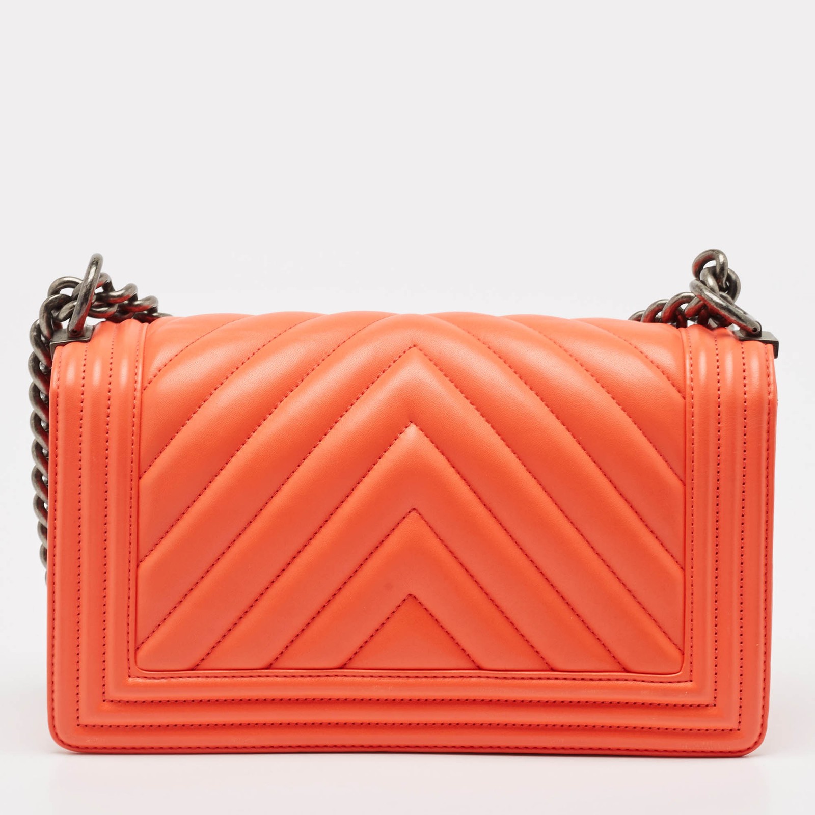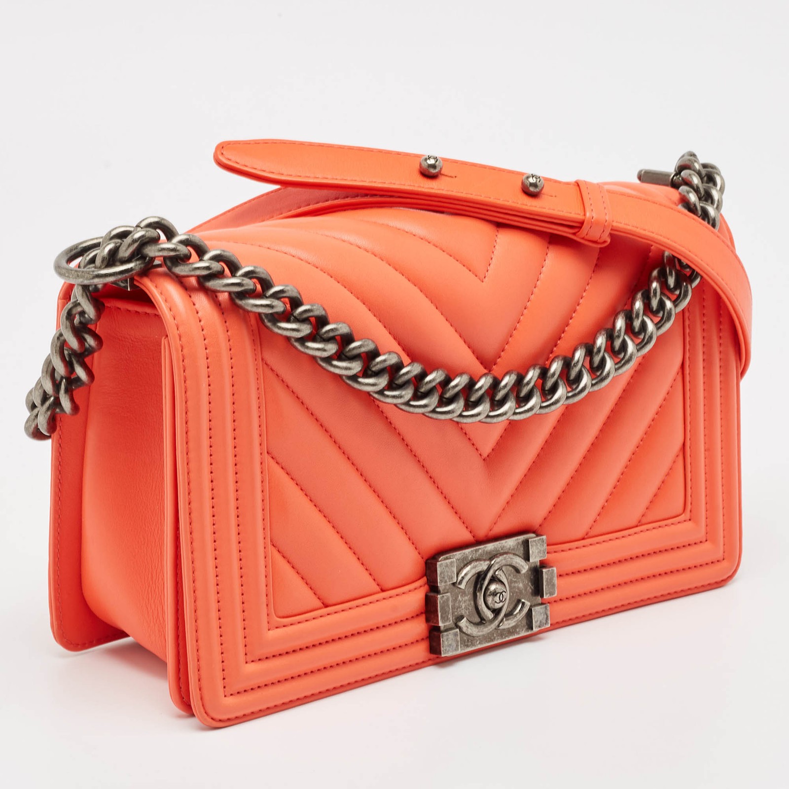 Designer bags are ideal companions for ample occasions Here we have a fashion meets functionality piece crafted with precision. It has been equipped with a well sized interior that can easily fit your small essentials.Certified by The Luxury Closet - This item has gone through a detailed authentication process overseen by our experts. We offer a lifetime guarantee of authenticity on all our items. Import duties, taxes and charges are not included in the item price. These charges are the buyers responsibility. Please check with your country’s customs office to determine what these additional cost will be prior to buying. Our eBay Store About Us Contact Us Add to Favorite Sellers Chanel Orange Chevron Leather Medium Boy Flap Bag $6143.5 Designer bags are ideal companions for ample occasions Here we have a fashion meets functionality piece crafted with precision. It has been equipped with a well sized interior that can easily fit your small essentials. Product Details Brand Color Orange Dimensions Height: 14 cm, Width: 8 cm, Length: 25 cm Material Leather Size Small Outsole Width Outsole Length Heel Height Includes Authenticity Card, The Luxury Closet Packaging Certified by The Luxury Closet This item has gone through a detailed authentication process overseen by our experts. We offer a lifetime guarantee of authenticity on all our items. How We Check The in-house team of experts at The Luxury Closet is highly trained to verify the authenticity and the condition of the luxury products. They ensure that only 100% authentic items are put on sale.The evaluation process is unique with its own mix of assessment criteria and differs according to the category. Each item is evaluated based on the following combination of hallmarks, hardware, stitching, symmetry, material, craftsmanship, stamping, codes, hologram stickers, and packaging. Our authenticators also check if the items have been modified or amended (e.g., aftermarket diamonds, replaced batteries, repaired bags, etc.) International Buyers Import duties, taxes and charges are not included in the item price. These charges are the buyers responsibility. Please check with your country’s customs office to determine what these additional cost will be prior to buying.