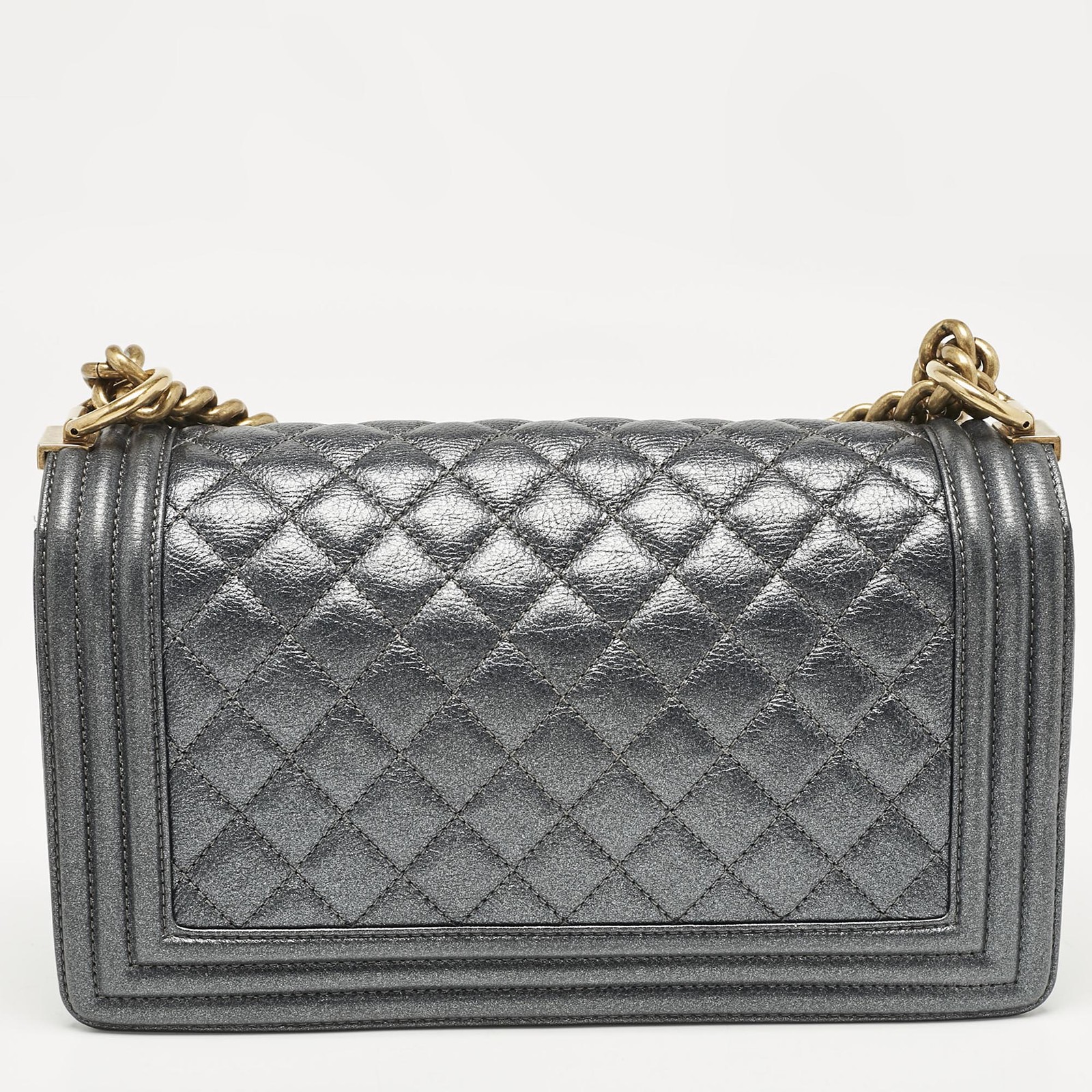 Designer bags are ideal companions for ample occasions Here we have a fashion meets functionality piece crafted with precision. It has been equipped with a well sized interior that can easily fit your small essentials.Certified by The Luxury Closet - This item has gone through a detailed authentication process overseen by our experts. We offer a lifetime guarantee of authenticity on all our items. Import duties, taxes and charges are not included in the item price. These charges are the buyers responsibility. Please check with your country’s customs office to determine what these additional cost will be prior to buying. Our eBay Store About Us Contact Us Add to Favorite Sellers Chanel Metallic Grey Quilted Leather Medium Boy Flap Bag $5464.8 Designer bags are ideal companions for ample occasions Here we have a fashion meets functionality piece crafted with precision. It has been equipped with a well sized interior that can easily fit your small essentials. Product Details Brand Color Grey Dimensions Height: 15 cm, Width: 6 cm, Length: 25 cm Material Leather Size Medium Outsole Width Outsole Length Heel Height Includes The Luxury Closet Packaging Certified by The Luxury Closet This item has gone through a detailed authentication process overseen by our experts. We offer a lifetime guarantee of authenticity on all our items. How We Check The in-house team of experts at The Luxury Closet is highly trained to verify the authenticity and the condition of the luxury products. They ensure that only 100% authentic items are put on sale.The evaluation process is unique with its own mix of assessment criteria and differs according to the category. Each item is evaluated based on the following combination of hallmarks, hardware, stitching, symmetry, material, craftsmanship, stamping, codes, hologram stickers, and packaging. Our authenticators also check if the items have been modified or amended (e.g., aftermarket diamonds, replaced batteries, repaired bags, etc.) International Buyers Import duties, taxes and charges are not included in the item price. These charges are the buyers responsibility. Please check with your country’s customs office to determine what these additional cost will be prior to buying.