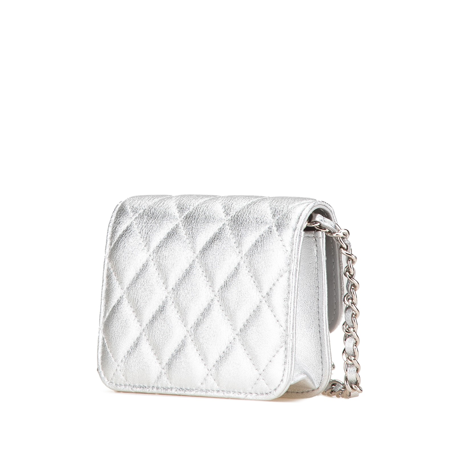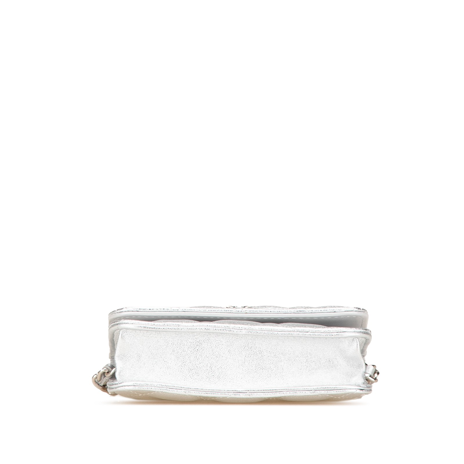 This crossbody bag features a quilted metallic goatskin leather body, a leather woven chain shoulder strap, and a front flap with magnetic snap closure. Condition Details: Lock Scratched. Embellishment Scratched. Exterior Handle Worn. Dimensions: Length: 8.500 cm Width: 12.000 cm Height: 2.500 cm SKU: 101017696 International Buyers - Please Note: Import duties, taxes, and customs fees are not included in the item price. These are the buyer's responsibility. Please check with your local customs office to understand any extra costs before buying. These fees are usually collected by the shipping company or when you pick up your item - they are not extra shipping charges.
