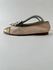 This is an authentic pair of CHANEL Leather Cap Toe Ballet Flats in pink and Gold, size 36. The classic style and superior quality of these Chanel flats make them a fabulous accent to your wardrobe. The sole is natural leather with a stacked wood heel. The uppers are featured in smooth pink leather with a gold herringbone-textured cap toe adorned with the Chanel CC logo and a bow detail. Wear these delightful flats with any number of looks from casual to dressy for a special touch of the timeless quality and style you can rely on from Chanel. Worldwide shipping via DHL Express