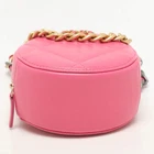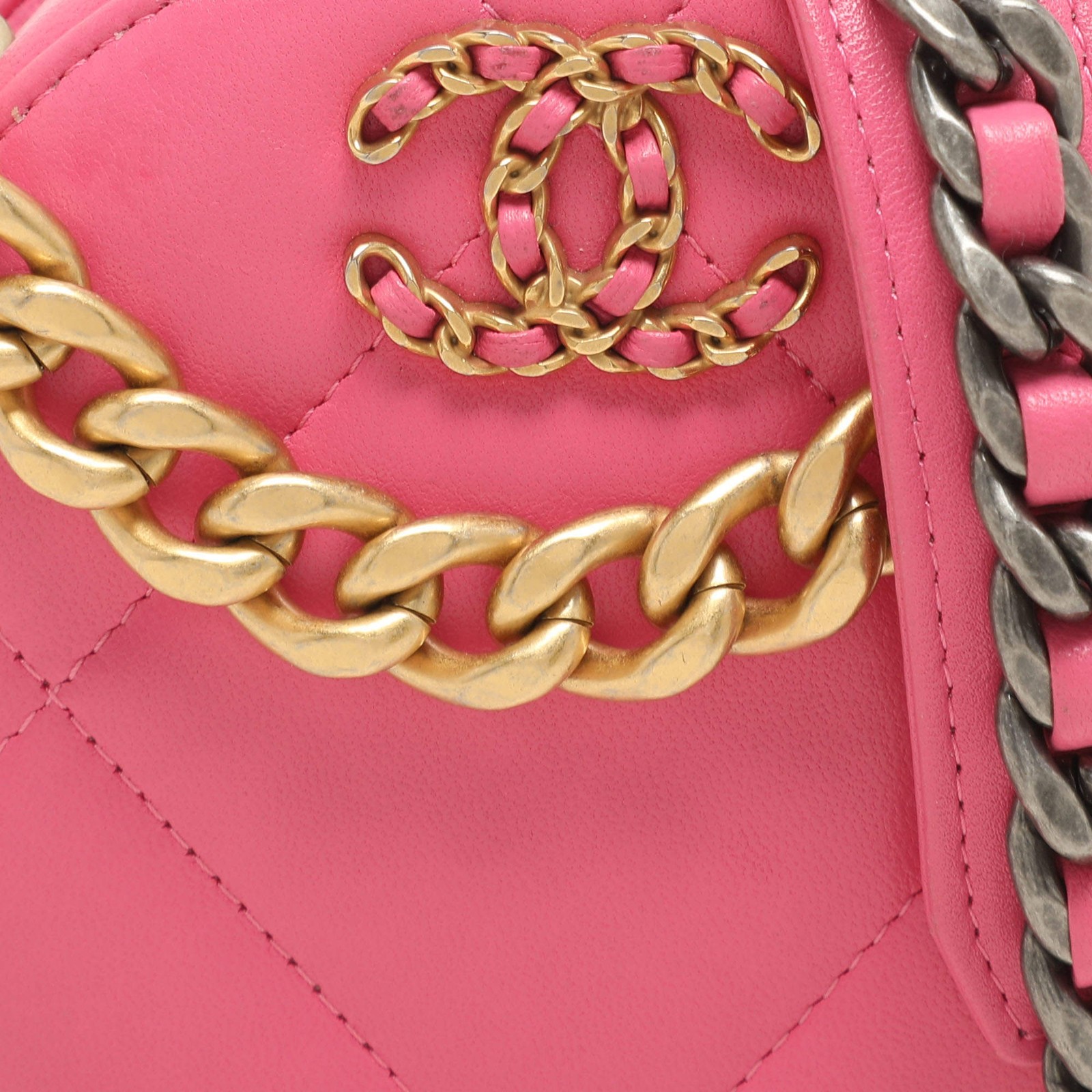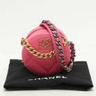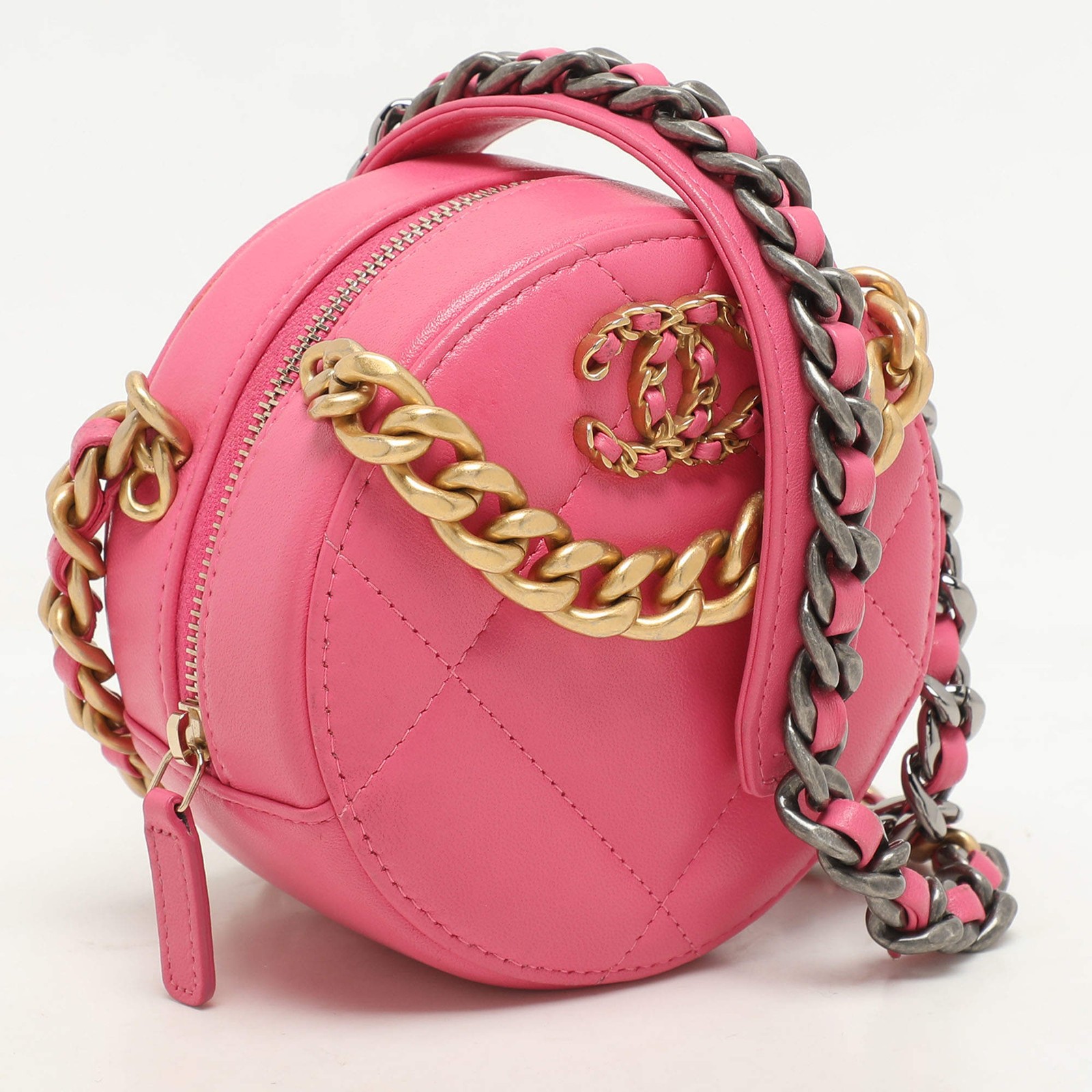 Our eBay Store About Us Contact Us Add to Favorite Sellers Chanel Pink Quilted Leather Chanel 19 Round Clutch Bag Delicate and iconic, this round Chanel 19 clutch is crafted from soft pink quilted leather and features the signature interwoven chain detail. Petite in size but big on style, it adds a pop of Parisian charm to any look with signature logo on the front and silver-gold-tone accents. Product Details Brand Chanel Includes Original Dustbag Certified by The Luxury Closet This item has gone through a detailed authentication process overseen by our experts. We offer a lifetime guarantee of authenticity on all our items. How We Check The in-house team of experts at The Luxury Closet is highly trained to verify the authenticity and the condition of the luxury products. They ensure that only 100% authentic items are put on sale.The evaluation process is unique with its own mix of assessment criteria and differs according to the category. Each item is evaluated based on the following combination of hallmarks, hardware, stitching, symmetry, material, craftsmanship, stamping, codes, hologram stickers, and packaging. Our authenticators also check if the items have been modified or amended (e.g., aftermarket diamonds, replaced batteries, repaired bags, etc.) Please note that this handbag may have a perfume scent, as it was stored and packaged in Dubai where such fragrances are commonly used. International Buyers Import duties, taxes and charges are not included in the item price. These charges are the buyers responsibility. Please check with your country’s customs office to determine what these additional cost will be prior to buying.