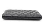Overview 144030016495 Chanel Quilted Caviar Yen Wallet. Silver-Tone Hardware. Height 3.75 IN X Length 7.25 IN X Width 1 IN, approximately. Great Pre-Owned Condition. Heavy and deep scratches on hardware with some patina on the zipper. Scratches on the interior leather. No stains found on the interior fabric. Entrupy Certificate #48QC678 Serial# 14548945 Model Number CARD SLOT WALLET Class HIGH Color BLACK Manufacturer CHANEL What's Included Entrupy Certificate Card What's Not Included Box, Dust Bag