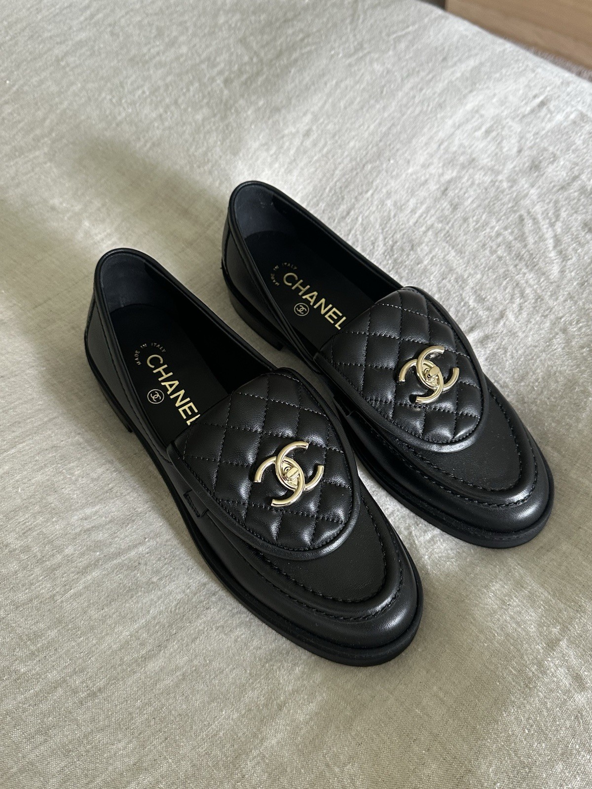 Chanel Quilted Leather Tab Loafers - Black 38.5