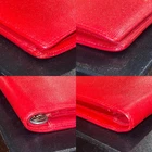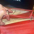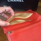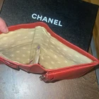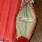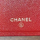 Chanel flap bifold wallet in a gorgeous cherry-red caviar leather. Gold-toned CC button on front flap (not a snap closure), ornamental purposes only. Slimmer than a Tri-fold wallet but packs plenty of storage with: 5 bills/receipt’s pockets 1 vertical extra large bill pocket 1 zippered coin-pouch w/a CC gold-toned round zipper-pull. & 8 CC vertical slots • Hologram in tact as shown in picture • Made in Italy in November of 2004 • No Inclusions