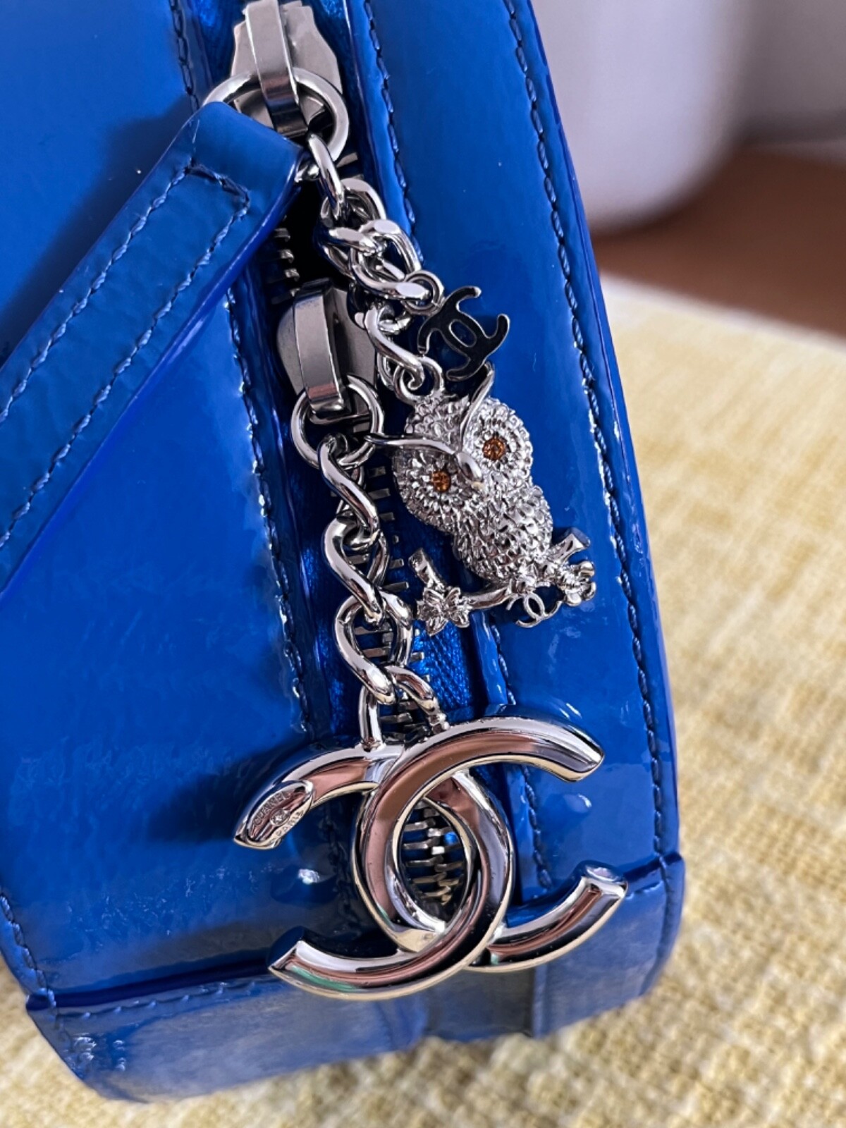 Brand new Chanel bag with Charms. Embroidered double CC on the front with top chunky metal handle chain. Ornate zipper details with CC logos and crystal owl charms. Detachable and adjustable crossbody/shoulder strap! Comes with dust bag only. Dimensions: 6.25” in diameter, 2.5” in depth/width Strap length: 21” - 23.5”