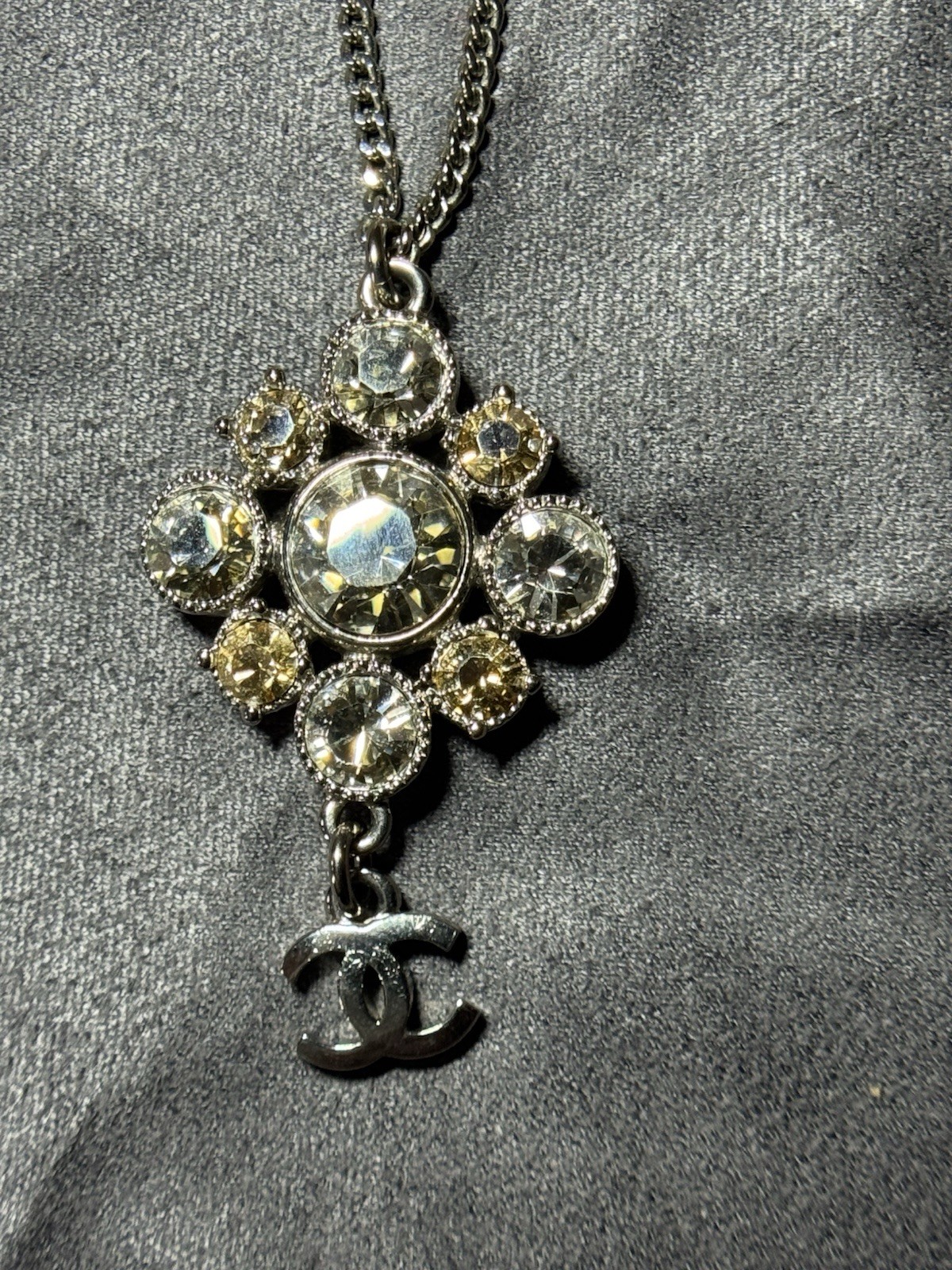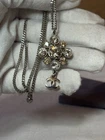 Authentic Chanel pendant necklace featuring a classic floral / clover motif set with clear and champagne-tone rhinestones. A timeless Chanel costume jewelry piece that sits beautifully at the collarbone. Elegant, versatile, and easy to style for both everyday wear and special occasions. ⸻ ✨ DETAILS • Brand: Chanel • Type: Pendant necklace • Length: Adjustable 16–18 inches • Closure: Lobster clasp with Chanel CC logo extender tag • Metal: Silver-tone (costume jewelry) • Stones: Clear & champagne-tone rhinestones • Color: Silver • Era: Modern (costume jewelry) ⸻ 📏 CONDITION Very good pre-owned condition. • Rhinestones appear intact and bright • Light surface wear consistent with normal use • No missing stones observed Please review all photos for details.