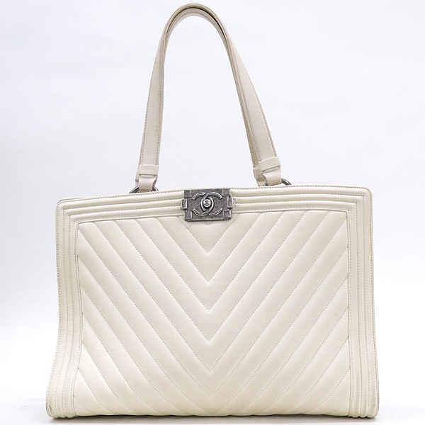 Size: 36 cm width/ 24 cm/ width 16 cm/ handle height 19 cm/ handle height : ivory accessories: Dust Chanel (Chanel) 17th season vintage boy logo decoration chevron leather tote and shoulder bag [Gangnam Main Store]. It is in units of 20. The store price is 6; 350; 000 won. The material is leather. There is a zipper pocket/small multi-use storage pocket on the inside. **Due to the nature of second-hand luxury goods, there may be stains not visible in the image. **