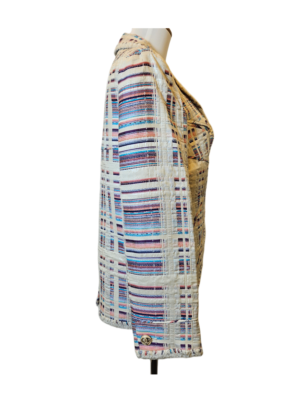 Collectors Chanel ecru/blue/coral lesage tweed jacket from Runway Cruise Collection by Karl Lagerfeld. Very rare piece with such beautiful details! Condition Details: This Jacket is in a very good condition Dimensions: Length: 0.000 cm Width: 0.000 cm Height: 0.000 cm SKU: 101011839 International Buyers - Please Note: Import duties, taxes, and customs fees are not included in the item price. These are the buyer's responsibility. Please check with your local customs office to understand any extra costs before buying. These fees are usually collected by the shipping company or when you pick up your item - they are not extra shipping charges.