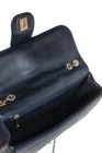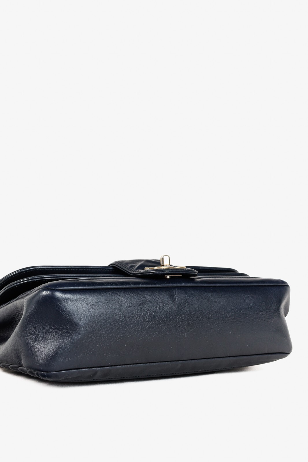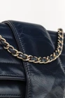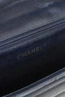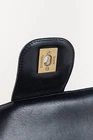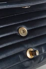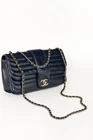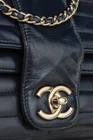 Circa the 1990's, this vintage France-made Mademoiselle bag from Chanel is crafted in a midnight blue leather with horizontal quilting, and features light gold-tone hardware, a chained shoulder strap that can be doubled up or worn long, a back slip pocket, and a turnlock closure embellished with the iconic interlocking CC logo. The front flap opens to a tonal leather-lined interior containing a magnetic-snap flap pocket, and a zip pocket. Condition: Excellent; light scratching on exterior, very light wear on flap edges, light discolouration on hardware, light marking and scratching on interior and under flap. Comes with authenticity card. Approximate Measurements: Height: 6" (15 cm) Width: 10" (25 cm) Depth: 2.5" (6 cm) Strap Drop: 19.25" (49 cm) Composition: Leather, textile lining, metal hardware.