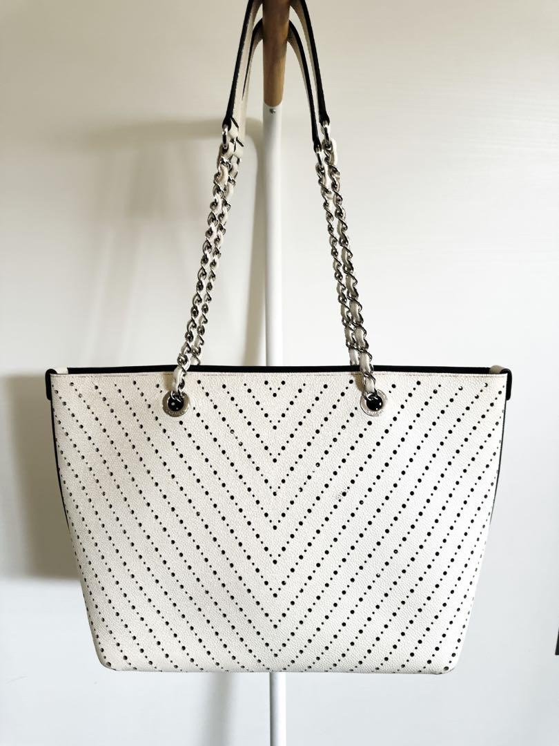 Absolutely love this Chanel tote! The white dot pattern is so chic and unique, and the leather feels amazing. Perfect size for daily use, and the chain strap adds a nice touch. Even with minor wear, it looks fantastic and feels very authentic. Great find!