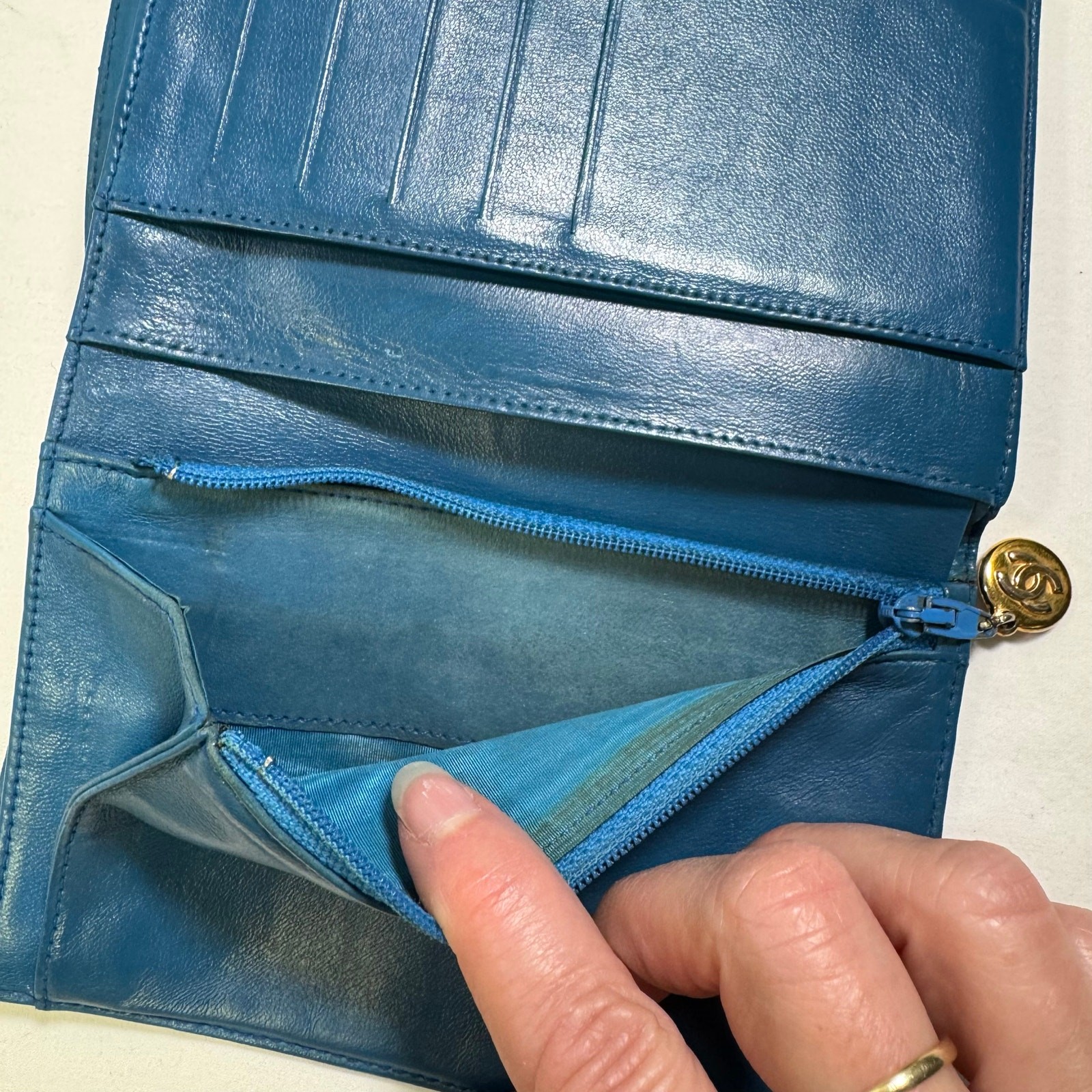Caviar leather Rare limited edition colorway Wallet opens to one coin pocket with another rear pocket behind it on the left. Center section has two larger pockets with five card slots. There is a money pocket behind both. Wallet has been professionally rehabbed with Angelus leather paint, sealer and conditioner. Ready for new owner! Leather is in excellent condition. Wallet is overall in excellent condition.