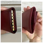 Moderately used overall. With one ring missing. Leather darkened overall. Interior with stains and dirt marks (cleaned). Wear on leather at one corner per pic. Buttons lock tight. One side pocket holds a card. Please look at the pics for details and feel free to send me questions.