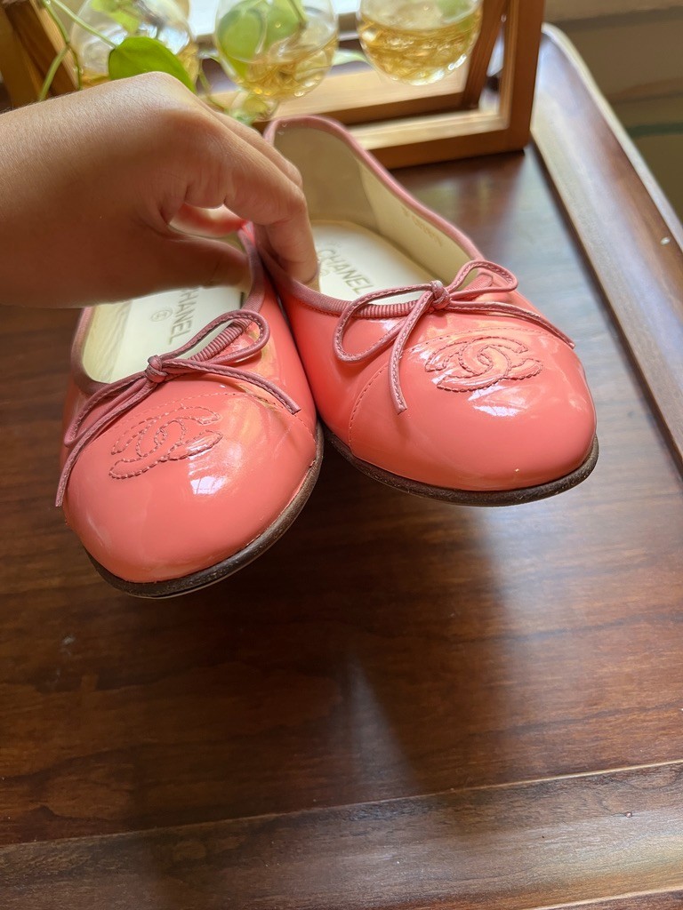 size 37.5. color is warm pink. the condition is really nice for a patent leather shoes in this color. Please see details in the pictures. Authentic. Only shoes will be included. Same or next day shipping including Sunday (on Sunday there will only be carrier scans; tracking will start to move on Monday).