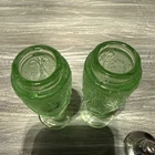 The Tiara Glass Sandwich Chantilly Green Salt and Pepper Shakers are a set of two elegant glass shakers adorned with a Chantilly pattern in a vibrant green color. Made with pressed glass, these shakers stand at 4 ¾ inches tall and are perfect for adding a touch of sophistication to any dining table. The Tiara brand ensures quality and unique design, making these shakers a stylish addition to any kitchen or dining room.