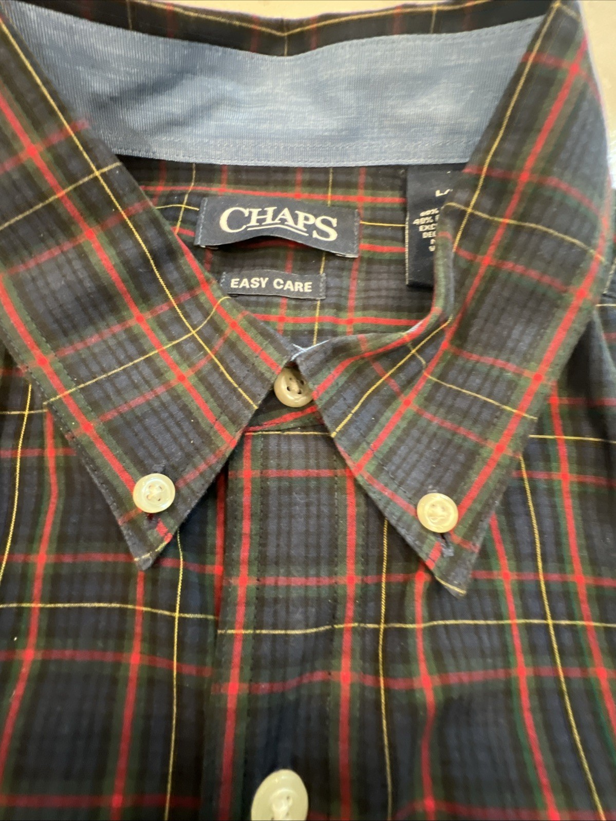 Upgrade your classic wardrobe with this Chaps men’s button-down shirt in size Large. Featuring a stylish red, green, and navy plaid pattern, this shirt is made from a comfortable cotton-polyester blend designed for easy care and everyday wear. Ideal for casual or business casual settings, this shirt includes a button-down collar and long sleeves with buttoned cuffs. Item Details: • Brand: Chaps • Size: Large (L/G) • Material: 60% Cotton, 40% Polyester • Color: Red/Green/Navy Plaid • Style: Button-down, Long Sleeve • Features: Easy Care, Button Collar, Chest Pocket • Made in: Vietnam • Condition: Gently pre-owned, excellent condition