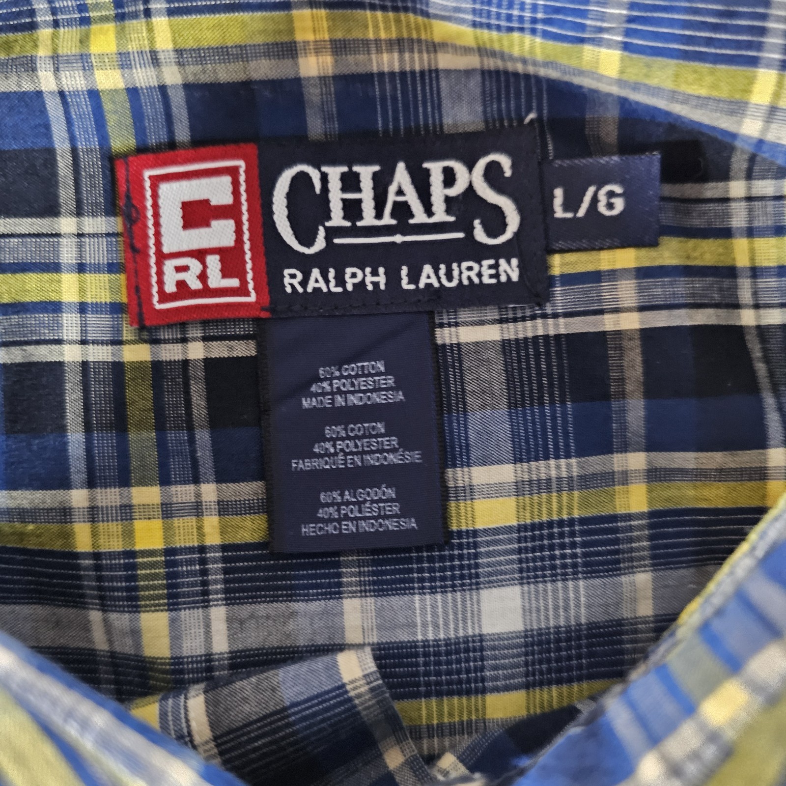 This Chaps Ralph Lauren Men's Long Sleeve Button Down Shirt in size Large features a classic blue/yellow striped pattern, made from a comfortable cotton blend material. With a collared neckline, button closure, and regular fit, this shirt is perfect for casual occasions. The shirt also includes pockets and is suitable for all seasons, making it a versatile addition to any man's wardrobe.