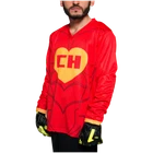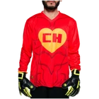 El Chapulin Soccer Goalkeeper Jersey by Geko Free Number CHAPULIN "El Chapulín Colorado" a popular Mexican superhero incorporates elements from the his costume. Red base with a yellow Heart. On the back his weapon of choice the Chipote Chillón or (Squeaky Mallet). Moisture management Microfiber Polyester 100% Made with highly breathable polyester fabric that keeps the freshness of the interior. The fibers these garments have been treated to protect skin of the solar rays, reducing the harmful affects that cause particular exposure to them. Designed and manufactured with Dye-Sublimation process front and sleeves, Mesh panels on the sides for greater breathability take the heat out. Padded Elbow and Forearm.