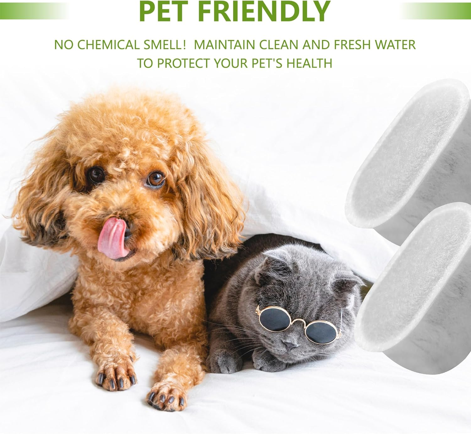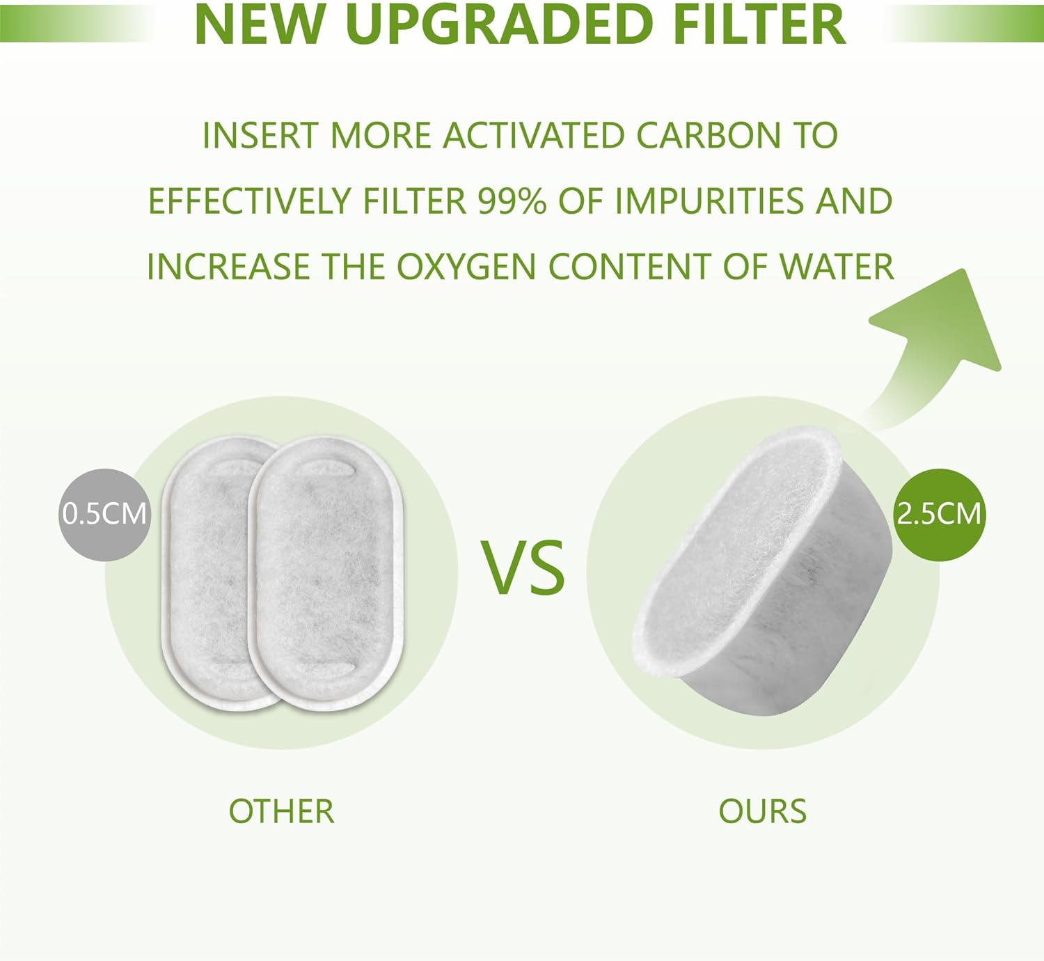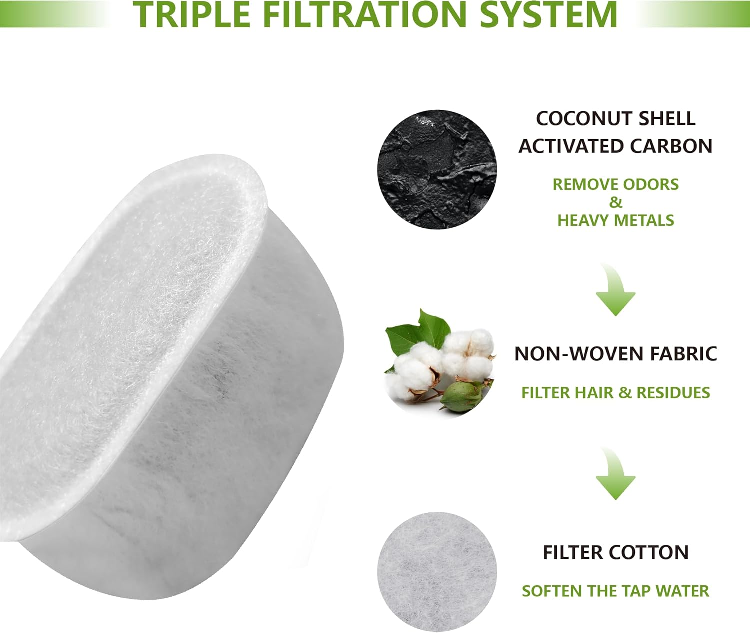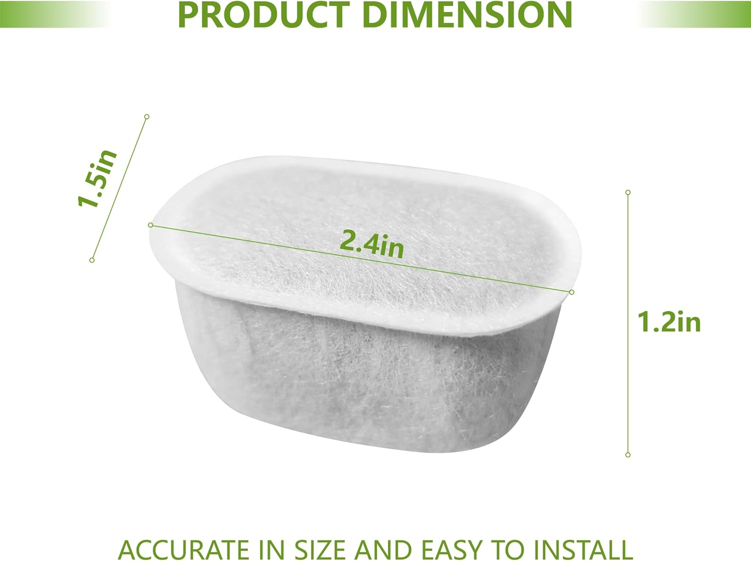 High Compatibility: This cat water fountain filter replacement is compatible with the W300, W300B, W500, and W500B automatic pet water fountains, available in capacities of 67fl oz/2L, 71fl oz/2.1L, and 118fl oz/3.5L. Featuring dimensions of 1.2" x 1.5" x 2.4" (L x W x H), it is accurately sized and straightforward to install Multiple Filtration: The filter for cat water fountain is saturated with premium activated carbon and non-woven fabric, fully isolates cat hair and food residue and removes impurities and particles, filter heavy metals and odors, soften tap water and obtain clean and fresh water Protect Your Pet: This water fountain filter for cats inside is made of high-quality materials, safe and odorless. It plays an important role in improving water quality and protecting the health of pets' urinary system to keep your pet healthy Regular Replacement: To ensure the health of your pets, please maintain the habit of changing the pet water fountain filter every two weeks Customer Service: If you are unsatisfied with automatic cat fountain filter, please feel free to contact us. We will strive to provide you with excellent after-sales service. water fountain for cats, pet water fountain for cats, cat fountain filter replacement, pet fountain replacement filters for w300 Product Description Cat Water Fountain Charcoal Filters Compatible with W300 W300B W500 Automatic Pet Water Fountain(6/12 pack) SPECIFICATION Material: Activated carbon and non-woven fabric Function: Filter hair, heavy metals, odors Package: 12pack cat dog water fountain filters replacement Compatible with W300 & W300B & W500 & W500B Automatic Pet Water Fountain. Improve the taste of water to keep your pet healthy Protect your pet!!! KEY FEATURES MULTIPLE FILTRATION Foam Sponge: isolate cat hair, food residue, and debris; Coconut shell activated carbon: filters micro particles such as sediment and rust to remove odors; NOTE Please place the cat filter in the correct direction as shown in the figure to give full play to the best filtering performance. RECOMMENDATION Before use, please soak the cat dog fountain filter in water for 2-5 minutes.
